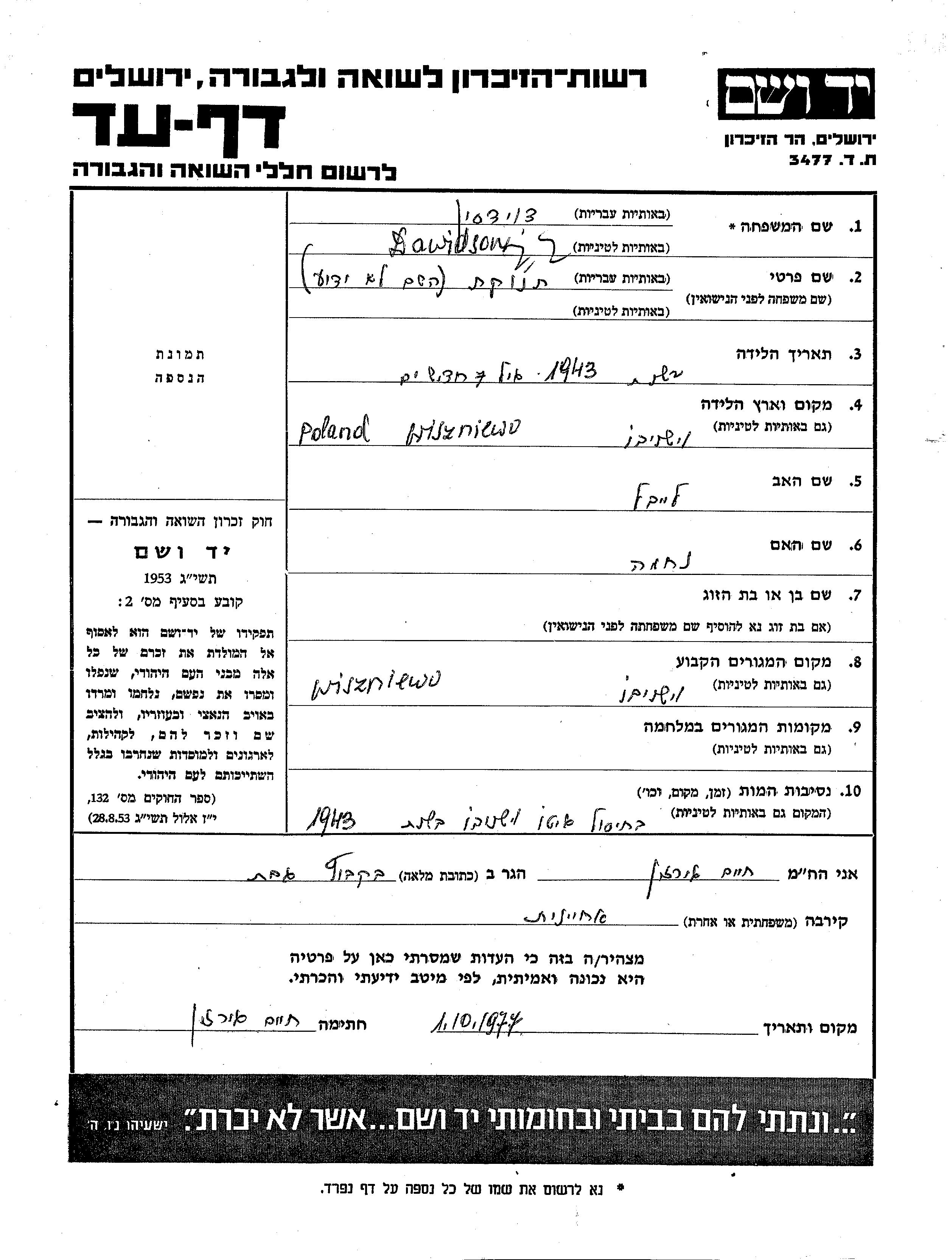 Dawidson Vorname unbekannt 1943 Wiszniew, Polen Gedenkblatt