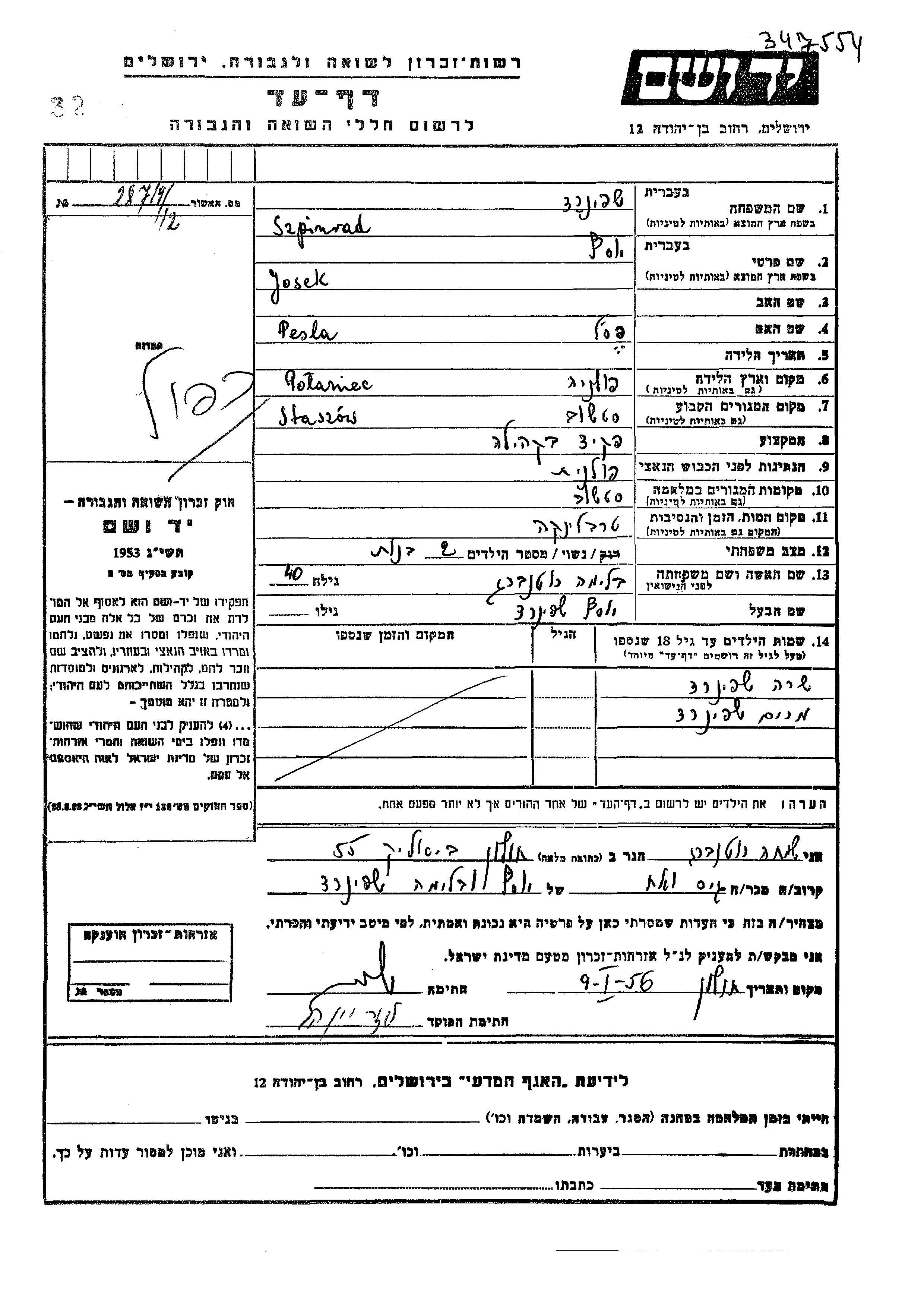 Szpinrad Miriam Staszow, Polen Gedenkblatt