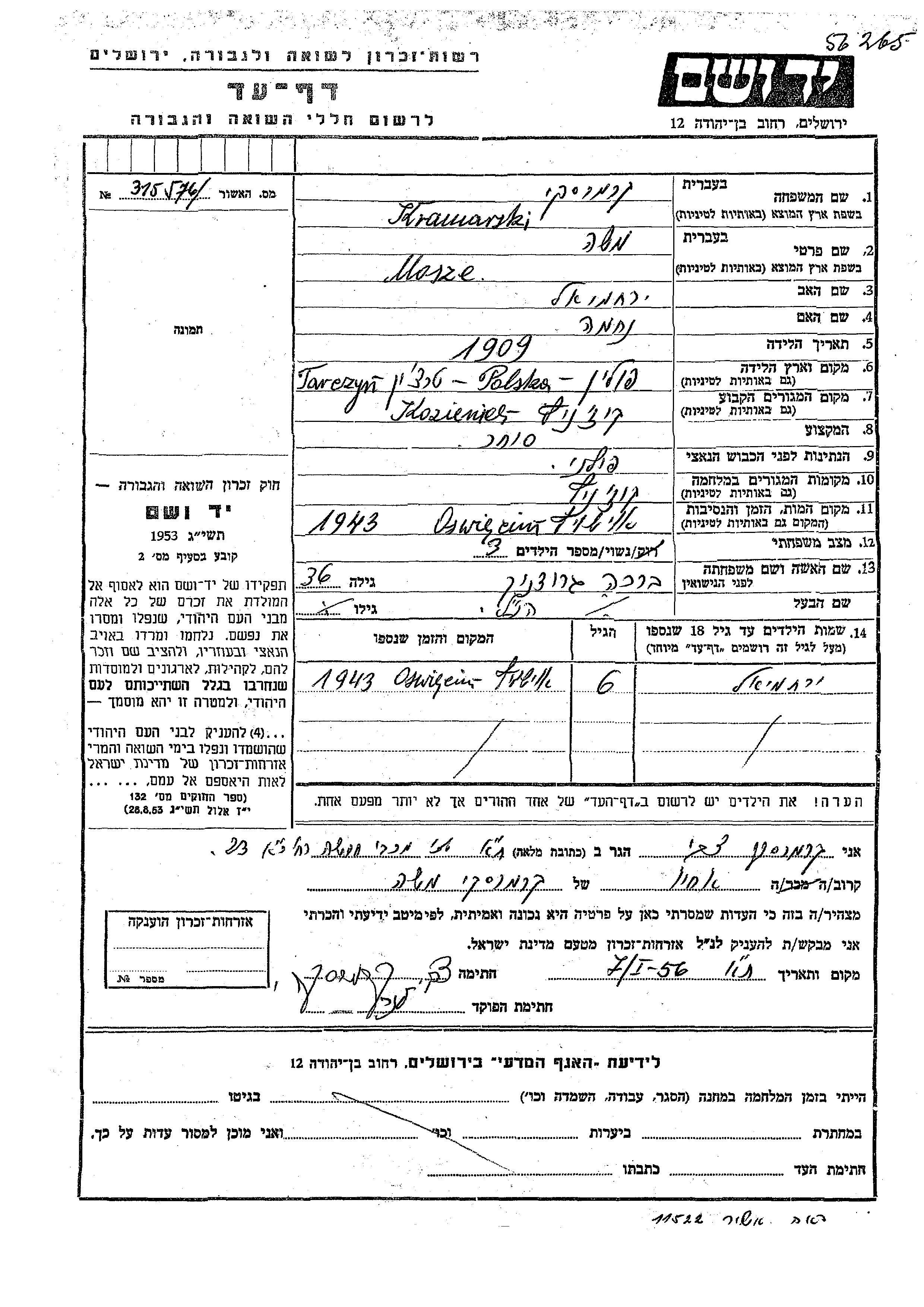 Yerakhmiel Kramarski wurde Er war der Sohn von Mosze und Brakha, geb. Grodnik. Er war Kind. Vor dem Zweiten Weltkrieg lebte er in Kozinic, Polen. Während des Krieges war er in Kozinic, Polen.