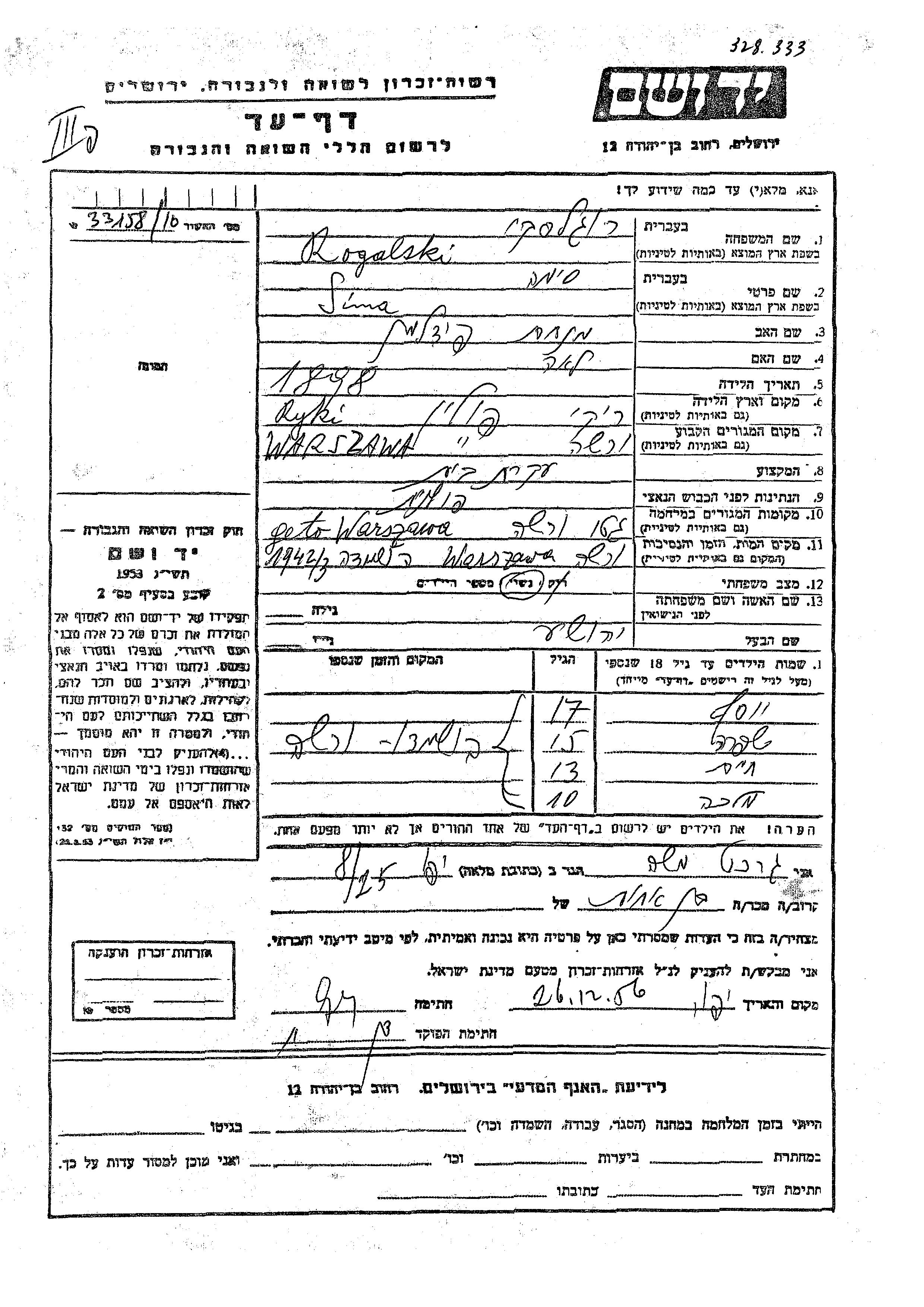 Malka Rogalski wurde Sie war die Tochter von Yehoshua und Sima, geb. Fidelman. Sie war Kind. Vor dem Zweiten Weltkrieg lebte sie in Warsaw, Polen. Während des Krieges war sie in Warsaw, Polen.