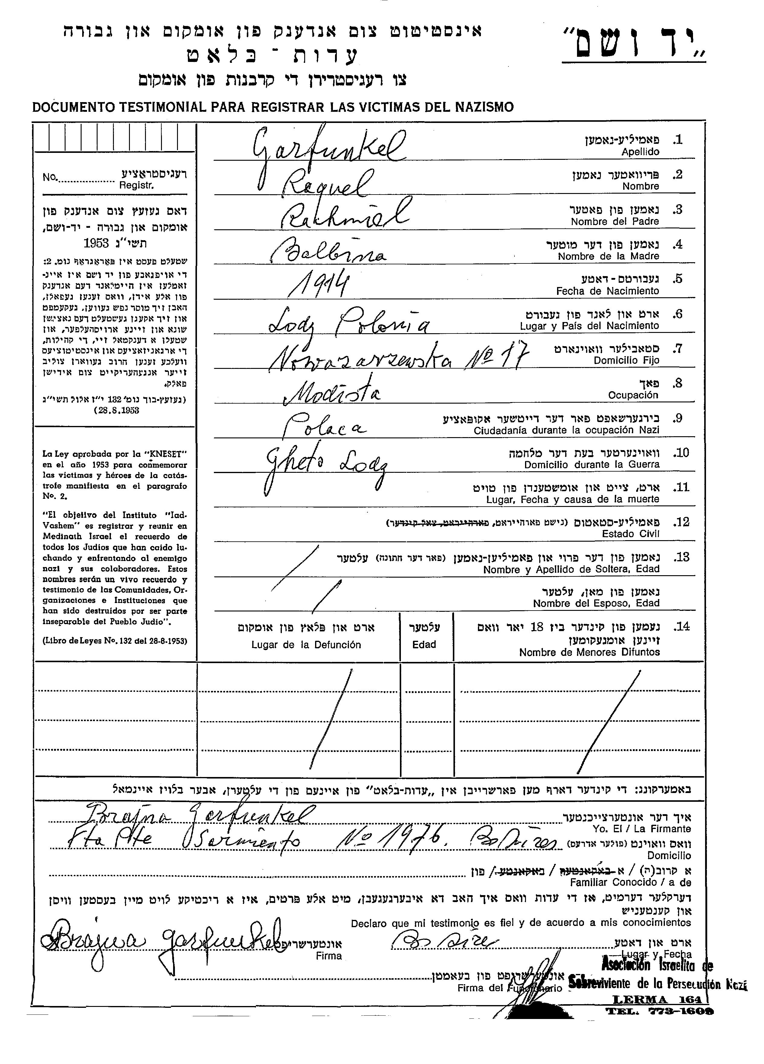 Raquel Garfunkel wurde im Jahr 1914 in Lodz, Polen geboren. Sie war die Tochter von Rachmiel und Balbina. Sie war Bekleidungsgestalterin und -näherin. Vor dem Zweiten Weltkrieg lebte sie in Lodz, Polen. Während des Krieges war sie in Lodz, Polen.