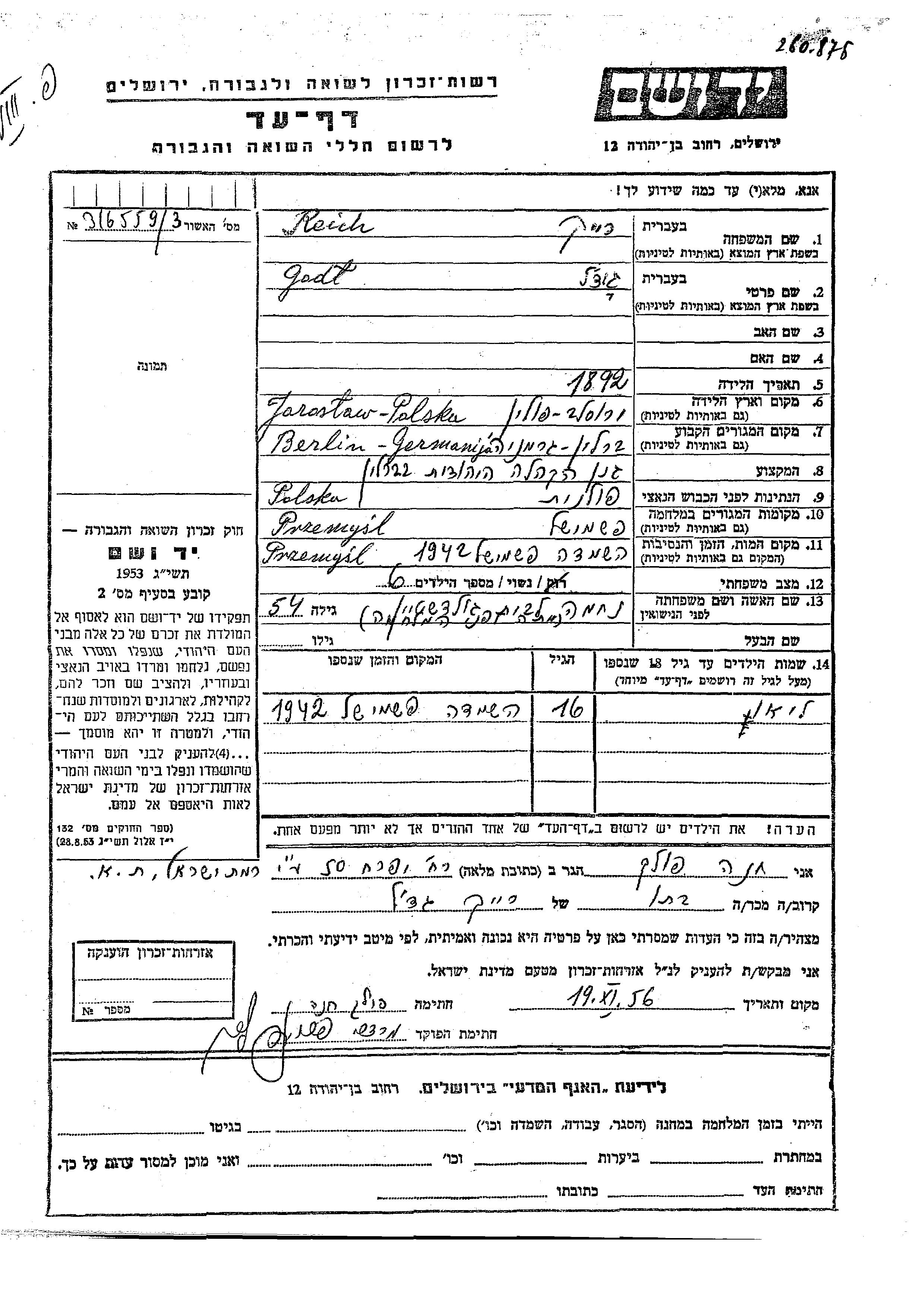 Leo Reich Reik wurde Er war der Sohn von Godl und Nekhama, geb. Goldshtein. Er war Kind. Vor dem Zweiten Weltkrieg lebte er in Berlin, Deutsches Reich. Während des Krieges war er in Przemysl, Polen.