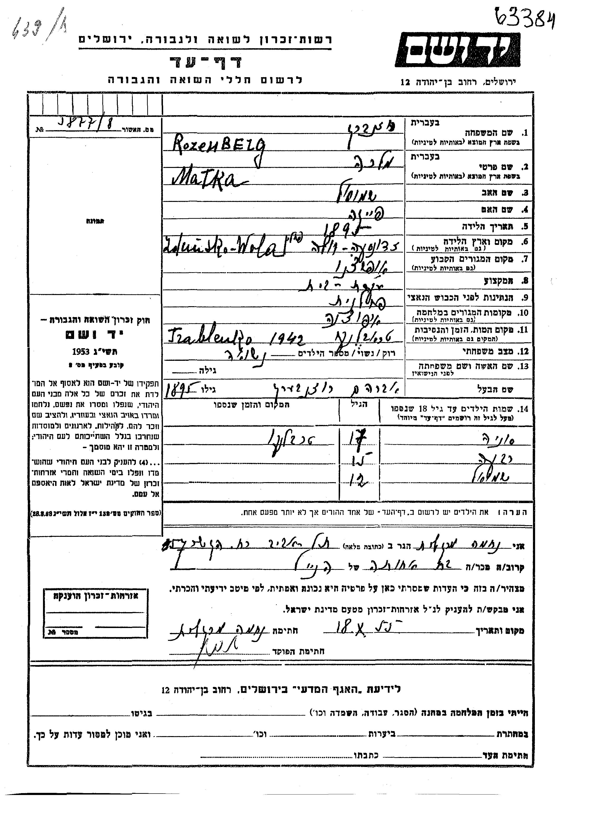 Rozenberg Rivka Opoczno, Polen Gedenkblatt