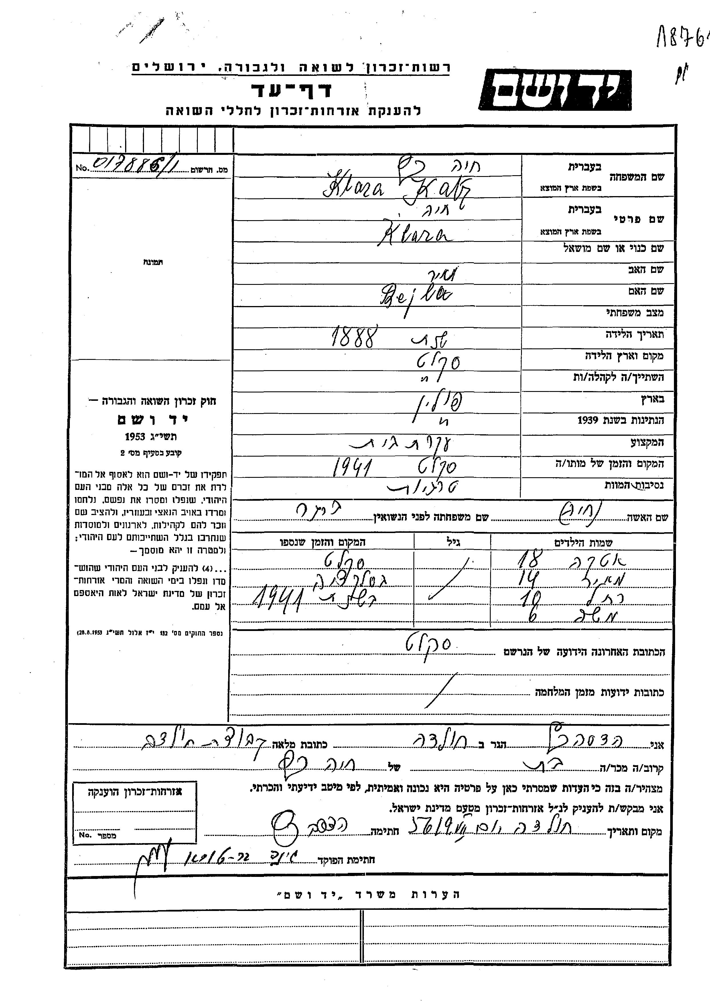 Rakhel Katz wurde Sie war die Tochter von Nakhum und Klara Khaia, geb. Berger. Sie war Kind. Vor dem Zweiten Weltkrieg lebte sie in Skalat, Polen.