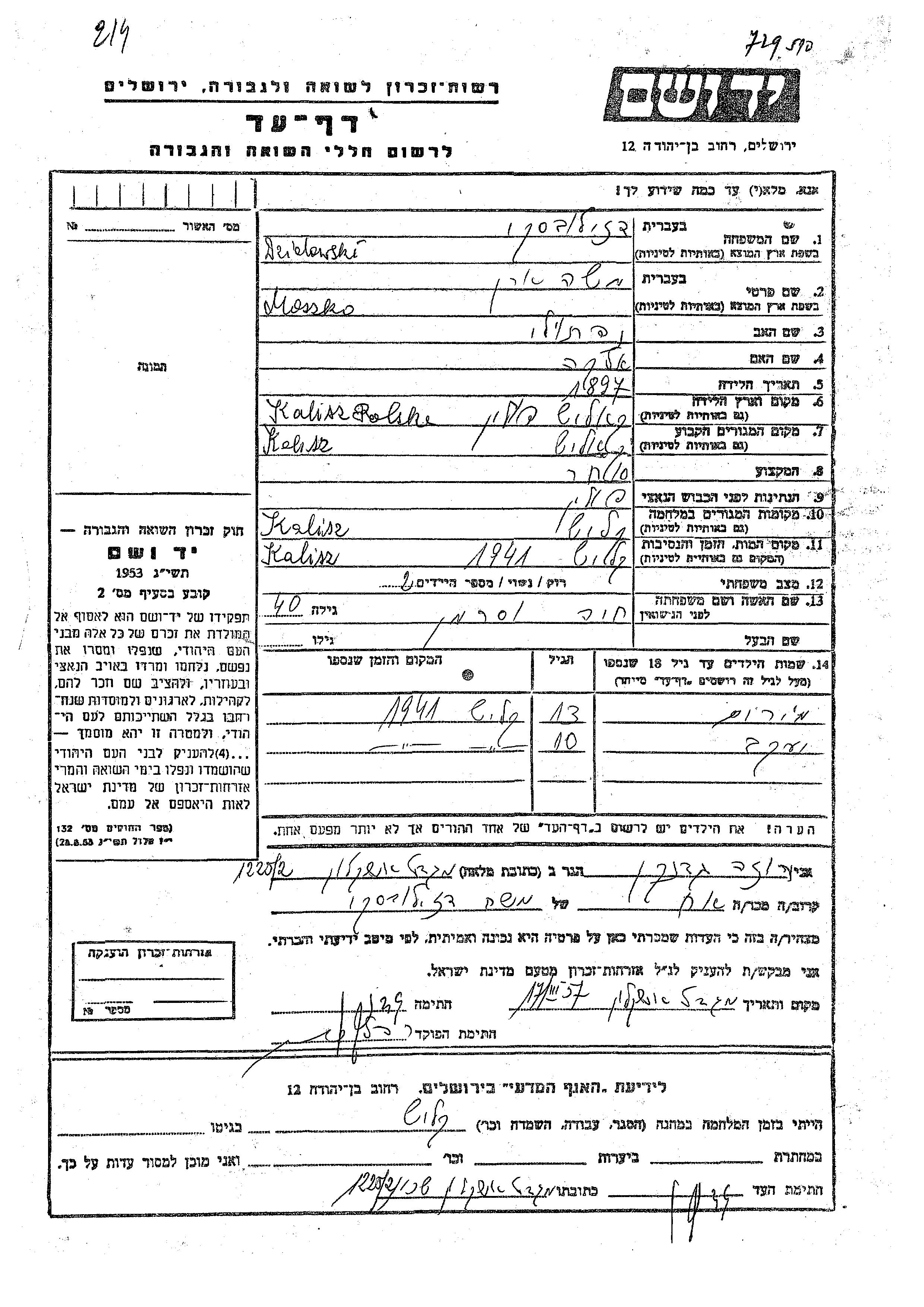 Dzielowski Miriam 1928 Kalisz, Polen Gedenkblatt