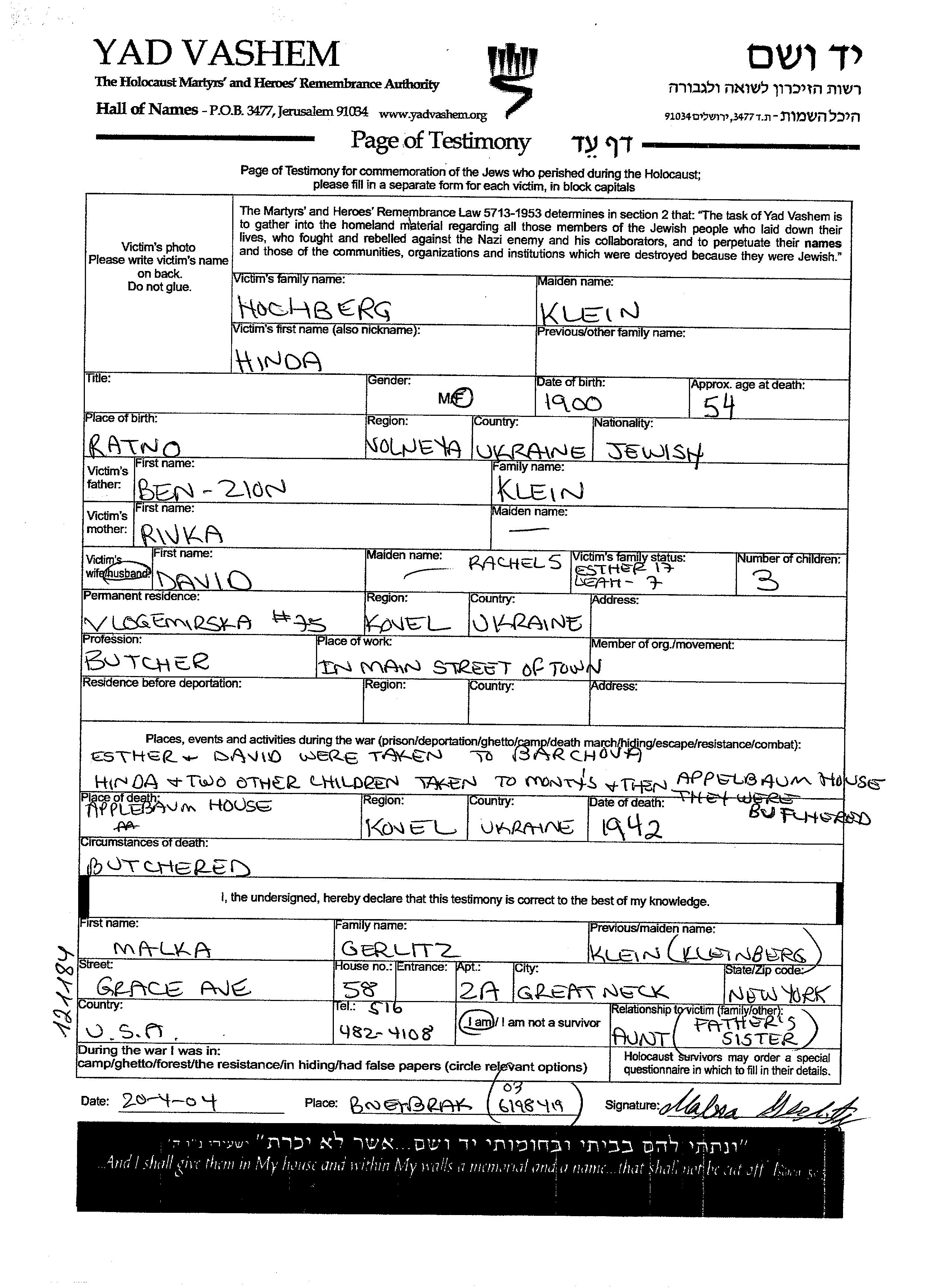Esther Hochberg wurde Sie war die Tochter von David und Hinda, geb. Klein. Sie war Kind. Vor dem Zweiten Weltkrieg lebte sie in Kovel, Polen. Während des Krieges war sie in Kovel, Polen.