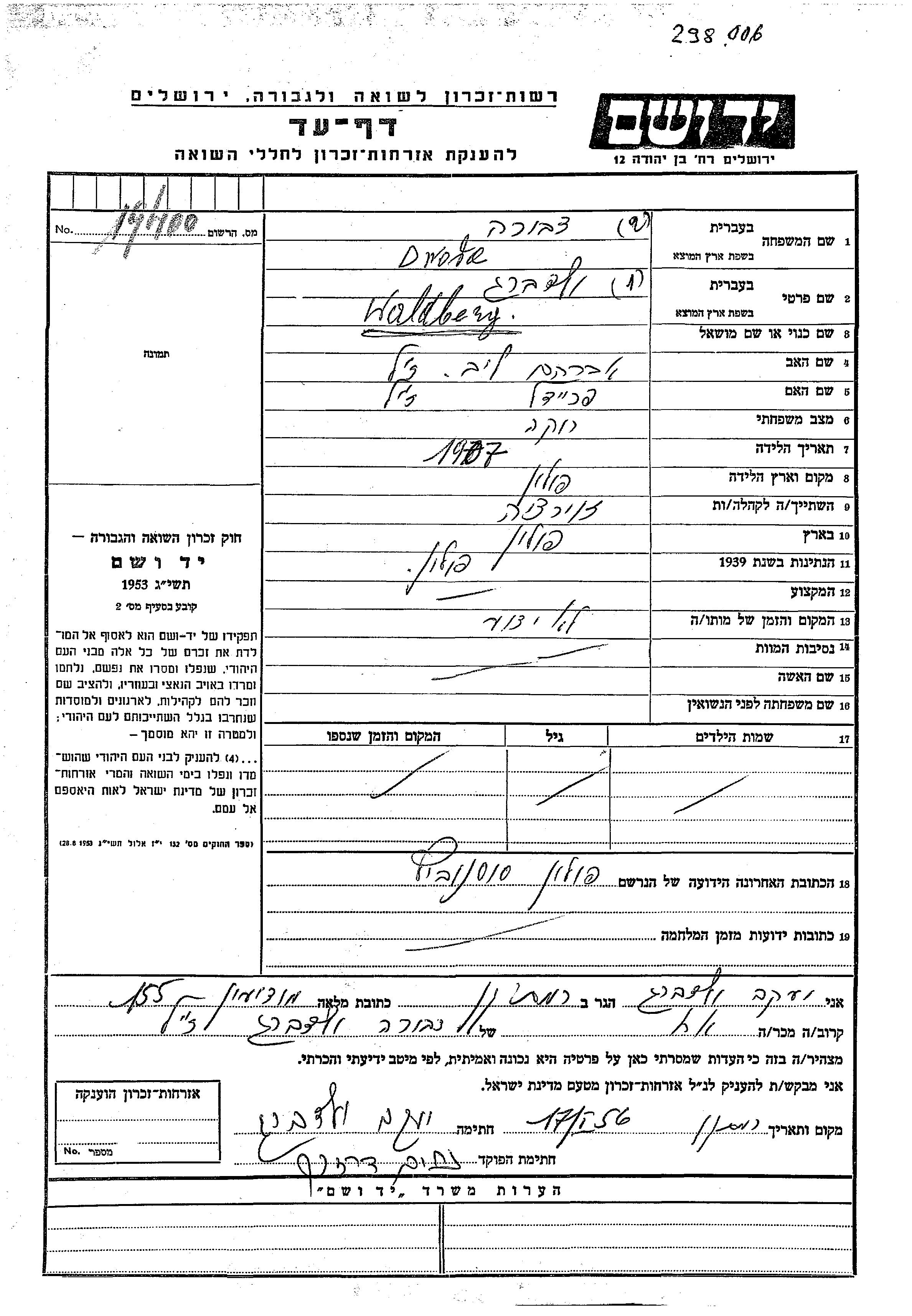 Dwora Waldberg wurde im Jahr 1907 in Polen geboren. Sie war die Tochter von Avraham Leib und Freidel. Sie war Ledig. Vor dem Zweiten Weltkrieg lebte sie in Polen. Während des Krieges war sie in Sosnowiec, Polen.