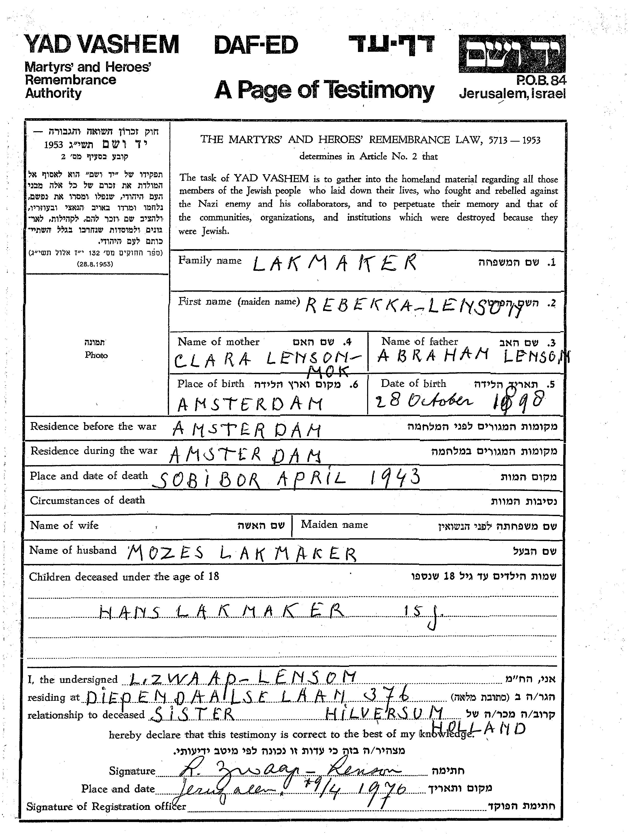 Hans Lakmaker wurde Er war der Sohn von Mozes und Rebekka, geb. Lenson. Er war Kind. Vor dem Zweiten Weltkrieg lebte er in Amsterdam, Niederlande. Während des Krieges war er in Amsterdam, Niederlande.