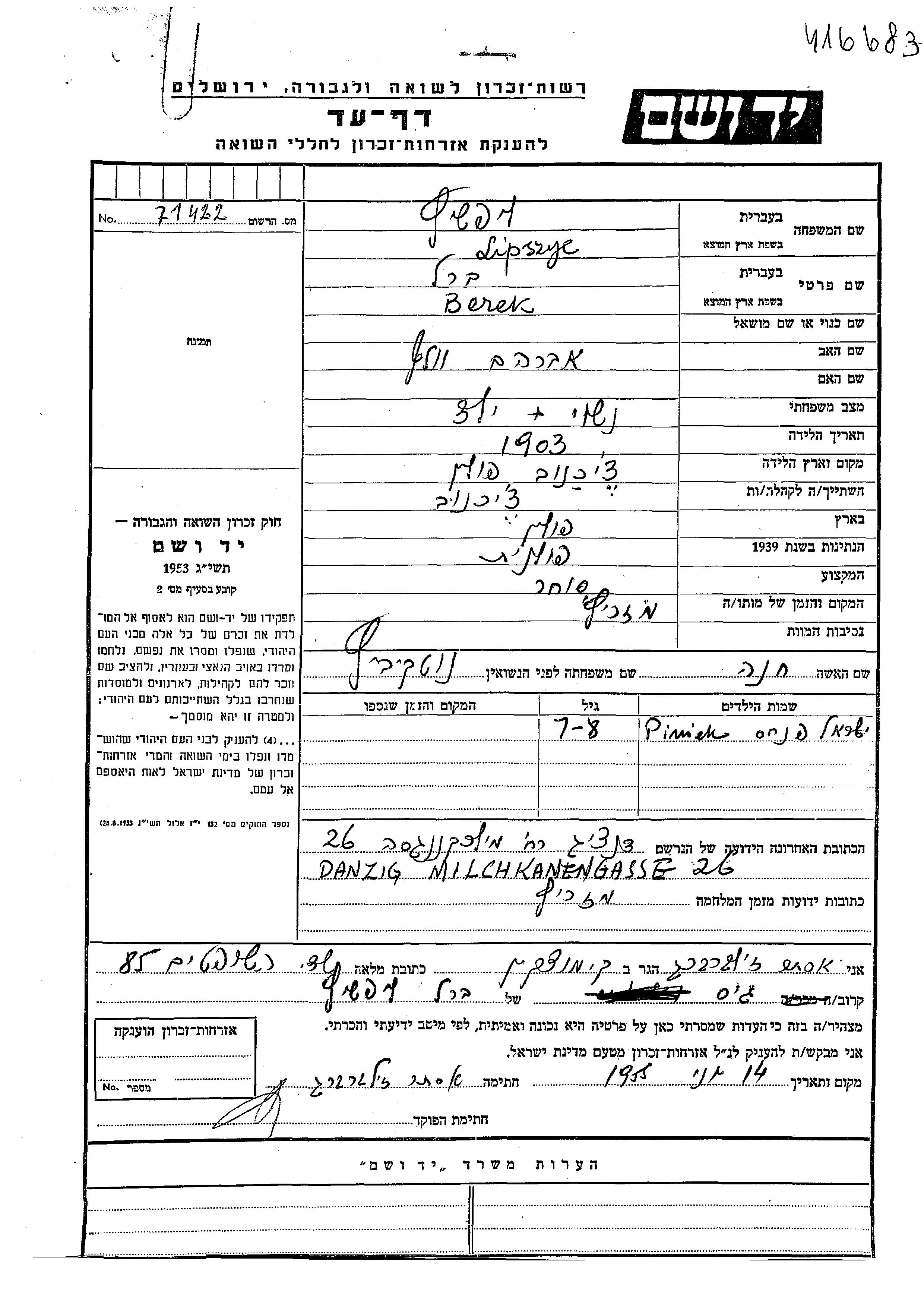 Yisrael Lifshitz wurde Er war der Sohn von Berl und Khana, geb. Nutkevitz. Er war Kind. Vor dem Zweiten Weltkrieg lebte er in Cechanow, Polen. Während des Krieges war er in Danzig, Freie Stadt Danzig.