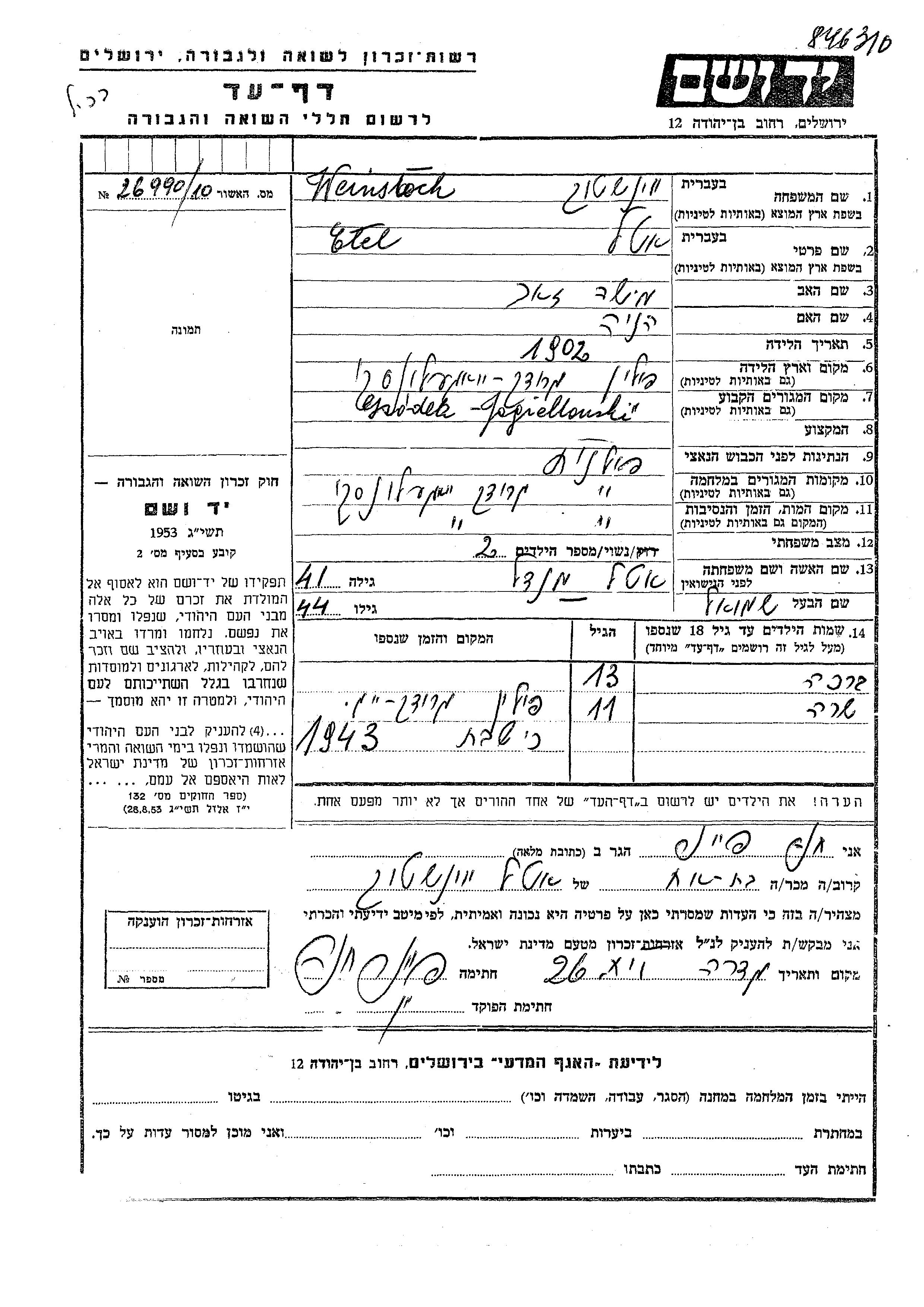 Brakha Weinstock wurde Sie war die Tochter von Shmuel und Etel, geb. Mandel. Sie war Kind. Vor dem Zweiten Weltkrieg lebte sie in Grodek Jagiellonski, Polen. Während des Krieges war sie in Grodek Jagiellonski, Polen.