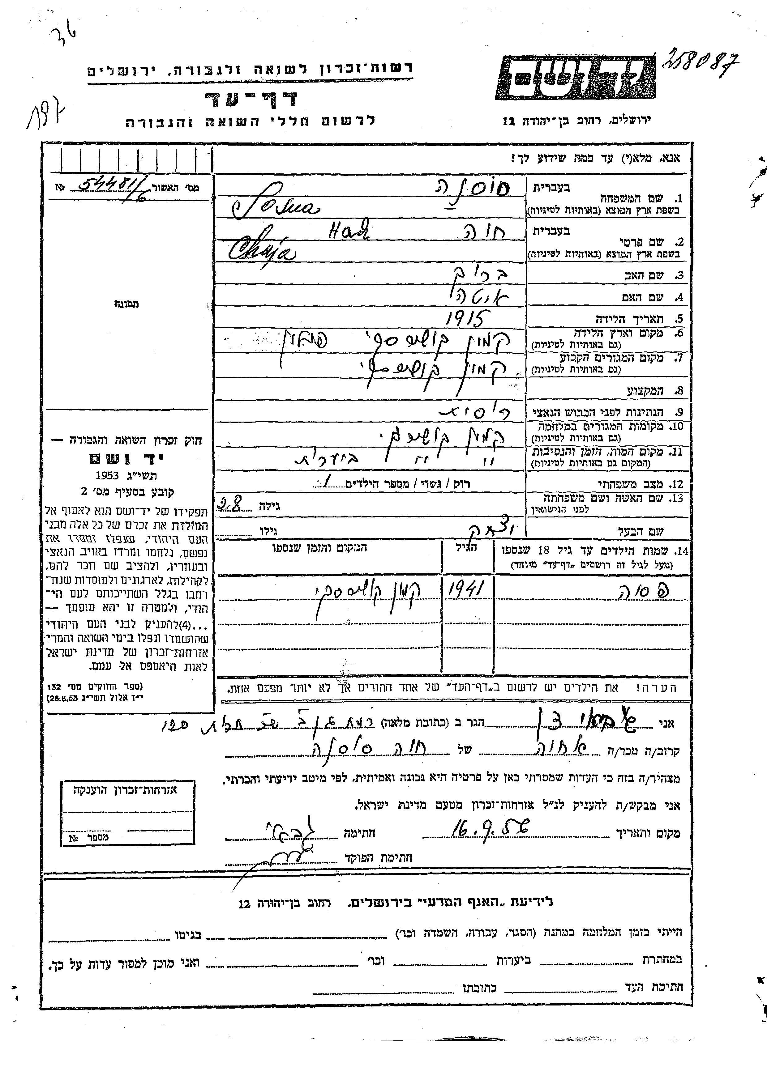 Pesia Sosna wurde im Jahr 1941 geboren. Er/sie war der/ die Sohn/Tochter von Yitzkhak und Chaja. Er/Sie war Kind. Vor dem Zweiten Weltkrieg er/sie in Kamin Kashirski, Polen. Während des Krieges war er/sie in Kamin Kashirski, Polen.