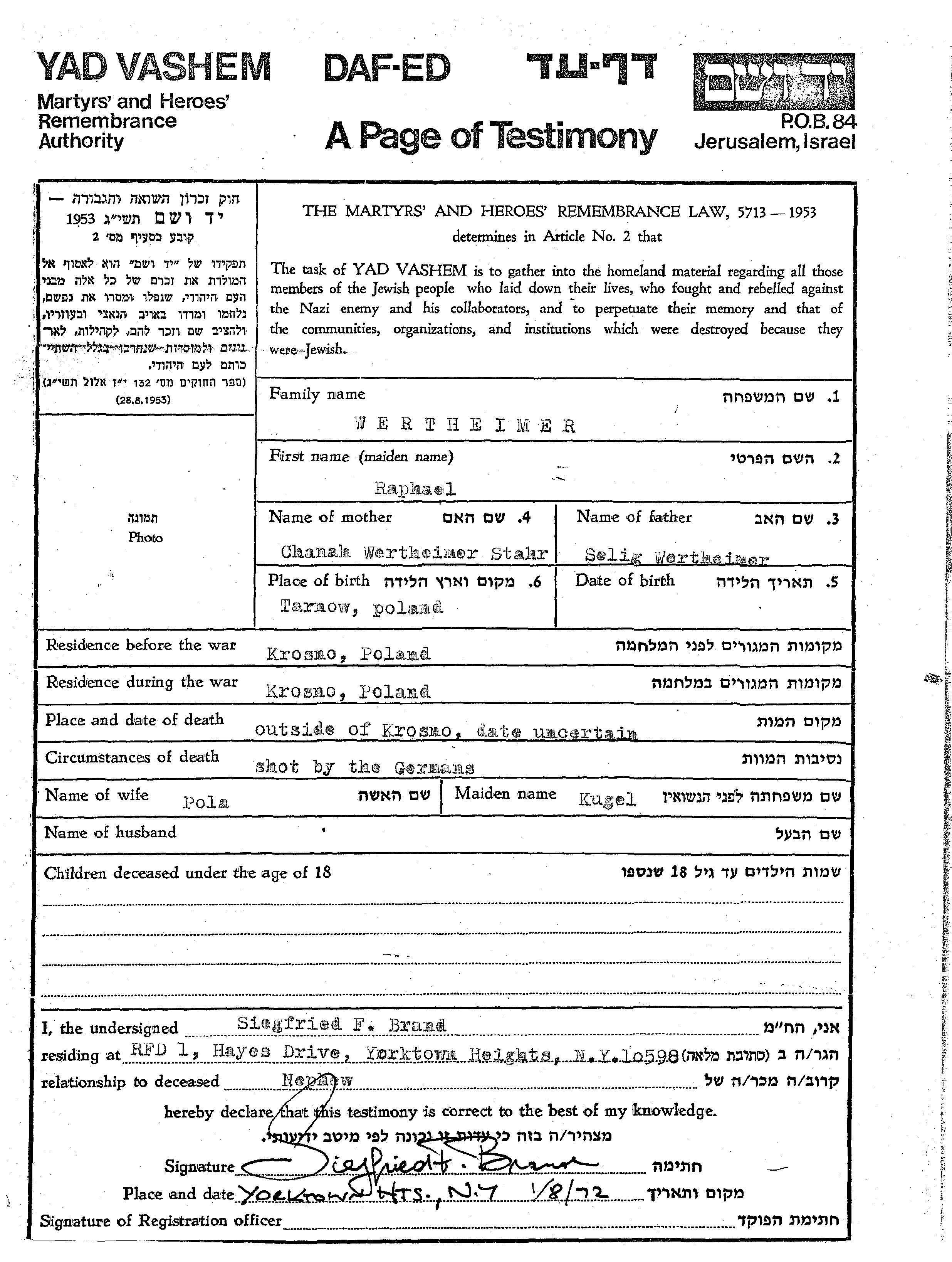 Raphael Wertheimer wurde in Tarnow, Polen geboren. Er war der Sohn von Selig und Chanah. Er war mit Pola, geb. Kugel Verheiratet. Vor dem Zweiten Weltkrieg lebte er in Krosno, Polen. Während des Krieges war er in Krosno, Polen.