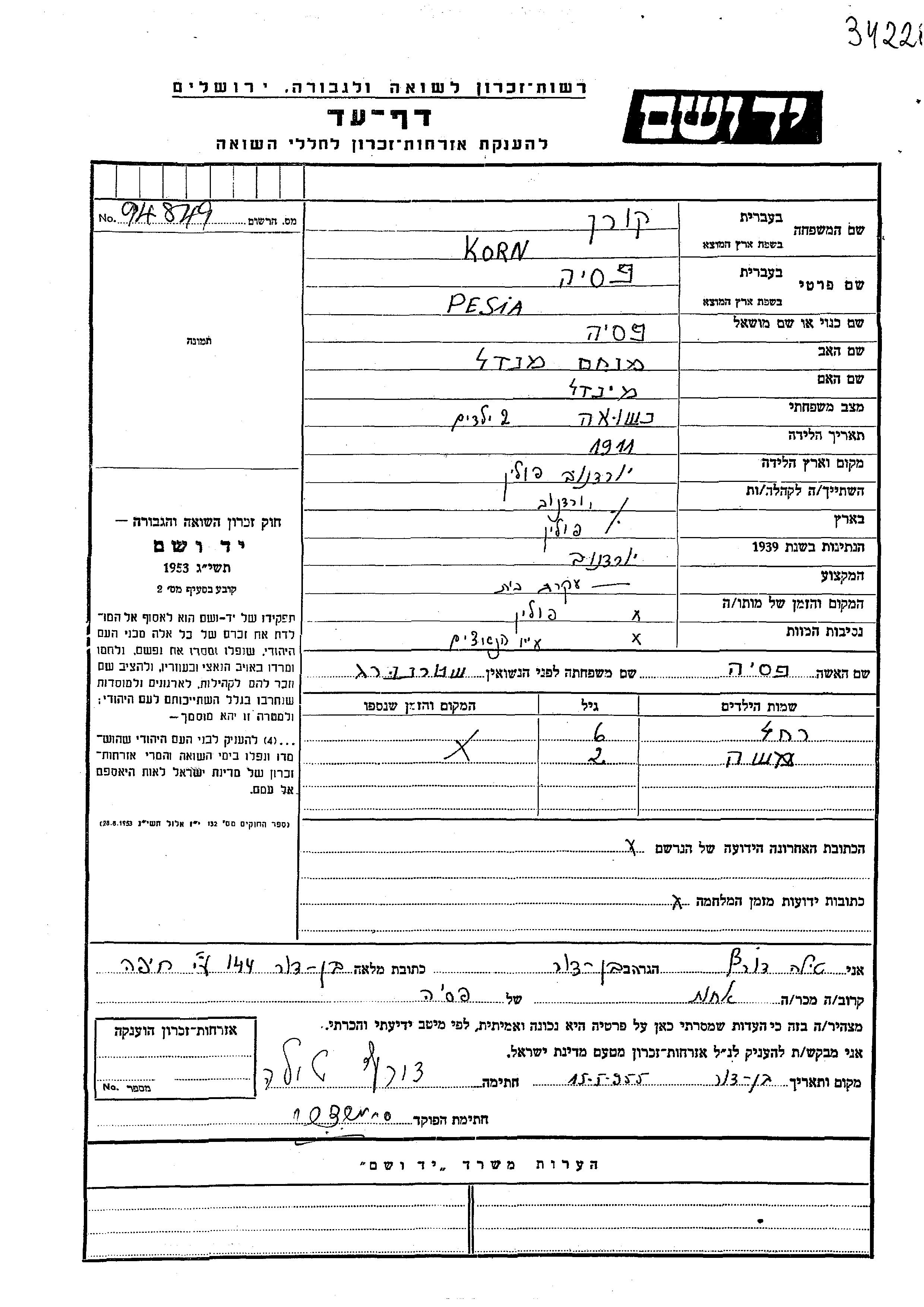 Rakhel Korn wurde Sie war die Tochter von Pesia, geb. Shternberg. Sie war Kind. Vor dem Zweiten Weltkrieg lebte sie in Jordanow, Polen.