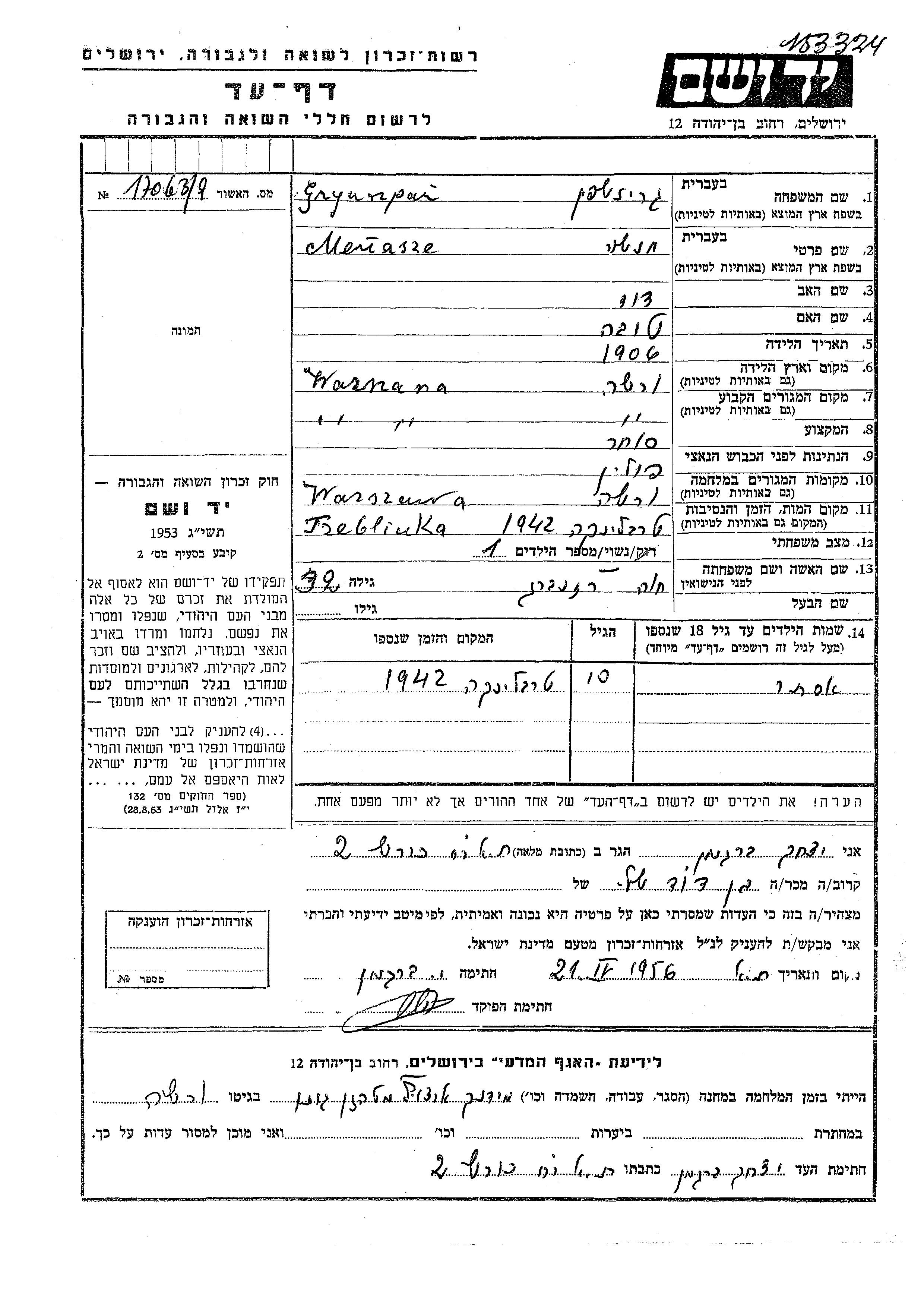 Ester Grynszpan wurde Sie war die Tochter von Menasze und Khava, geb. Rozenberg. Sie war Kind. Während des Krieges war sie in Warsaw, Polen.