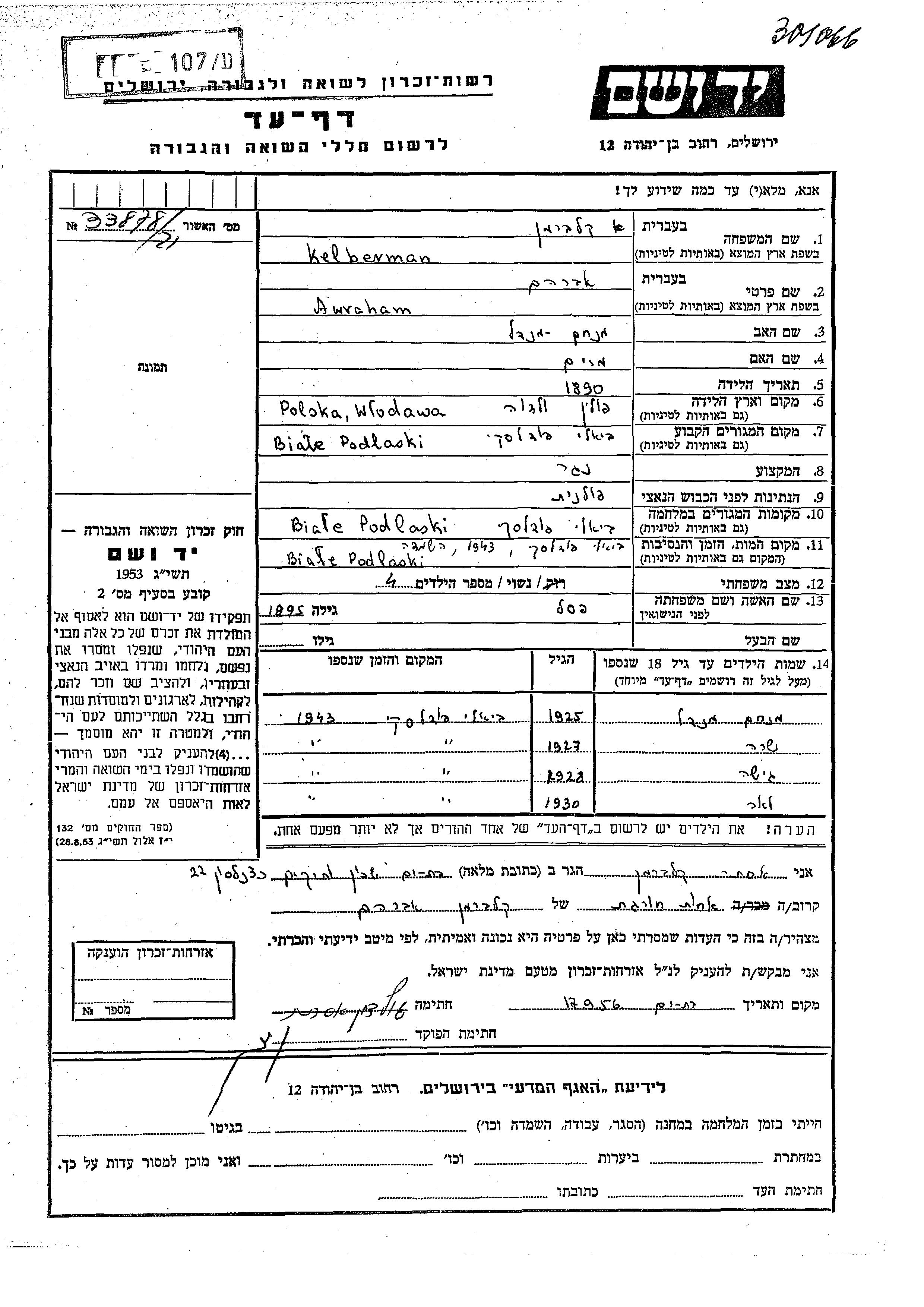Kelberman Guta 1928 Biale Podlask, Polen Gedenkblatt