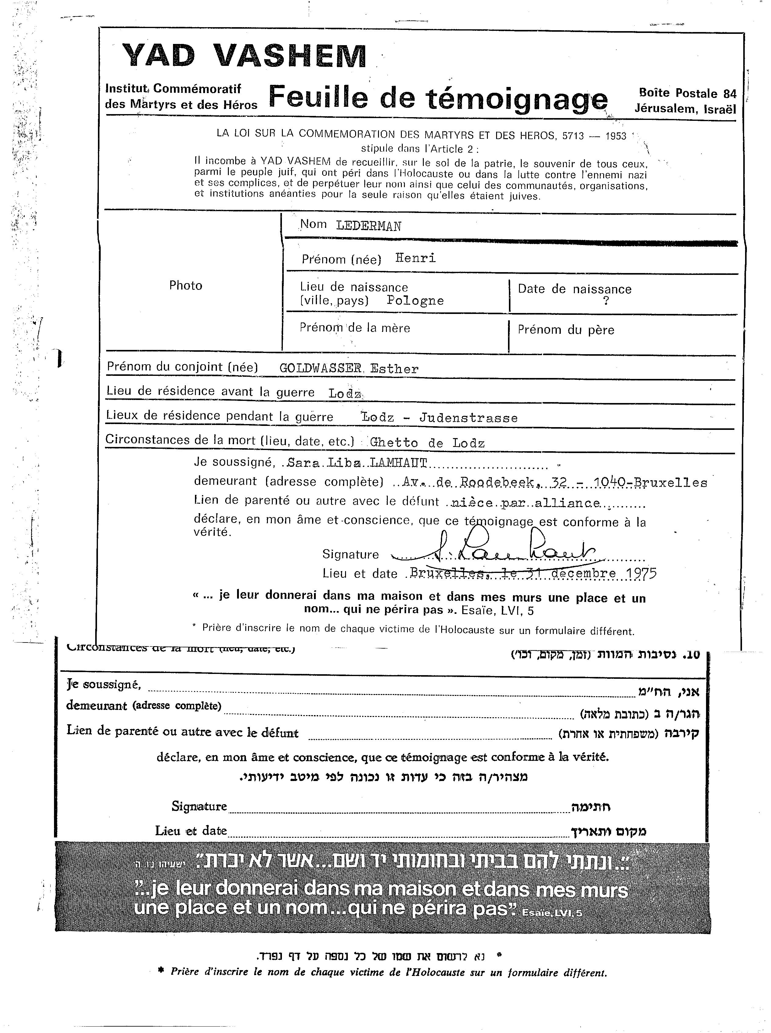 Henri Lederman wurde in Polen geboren. Er war mit Esther, geb. Goldwasser Verheiratet. Vor dem Zweiten Weltkrieg lebte er in Lodz, Polen. Während des Krieges war er in Lodz, Polen.