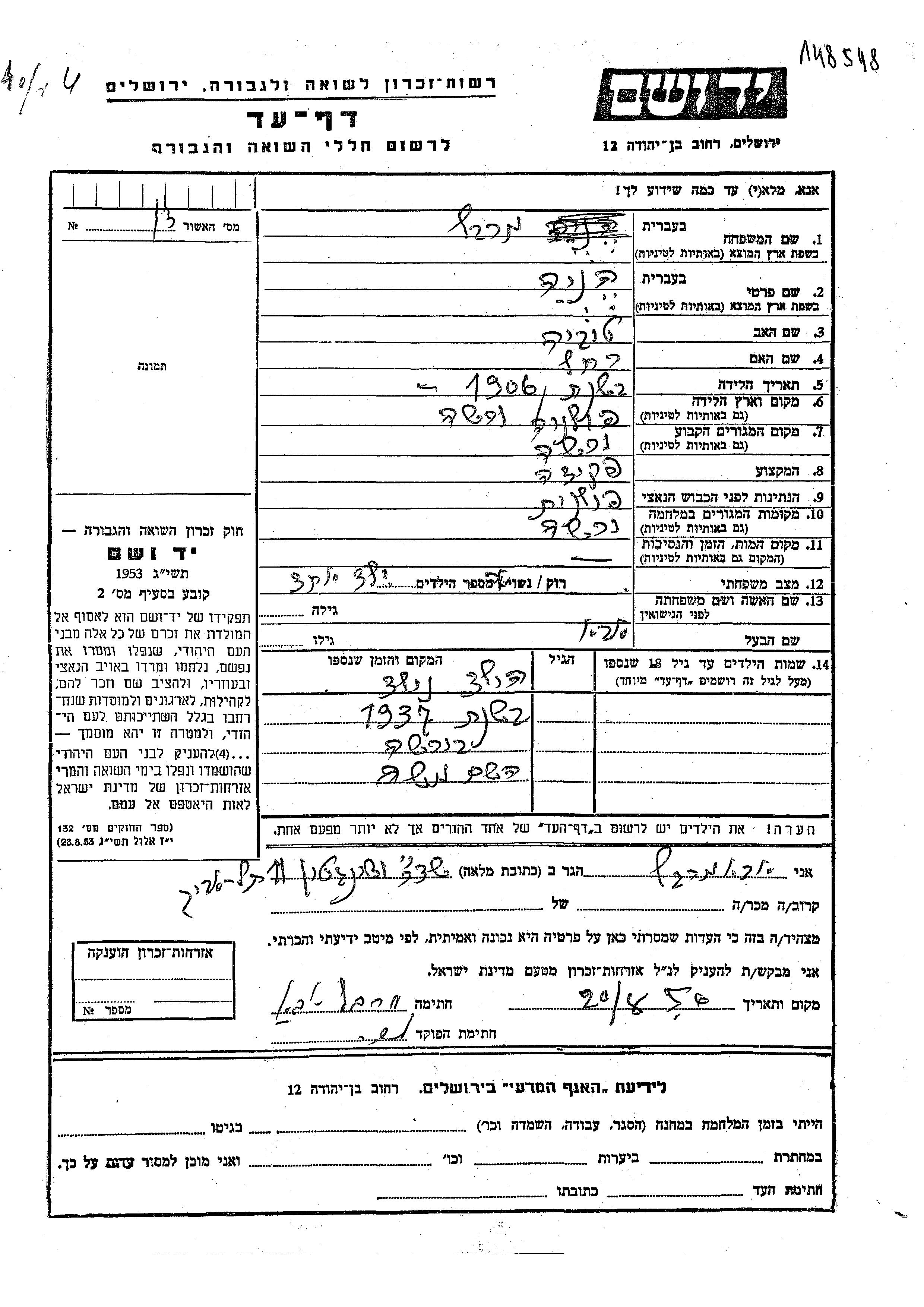Merbel Moshe 1937 Warsaw, Polen Gedenkblatt