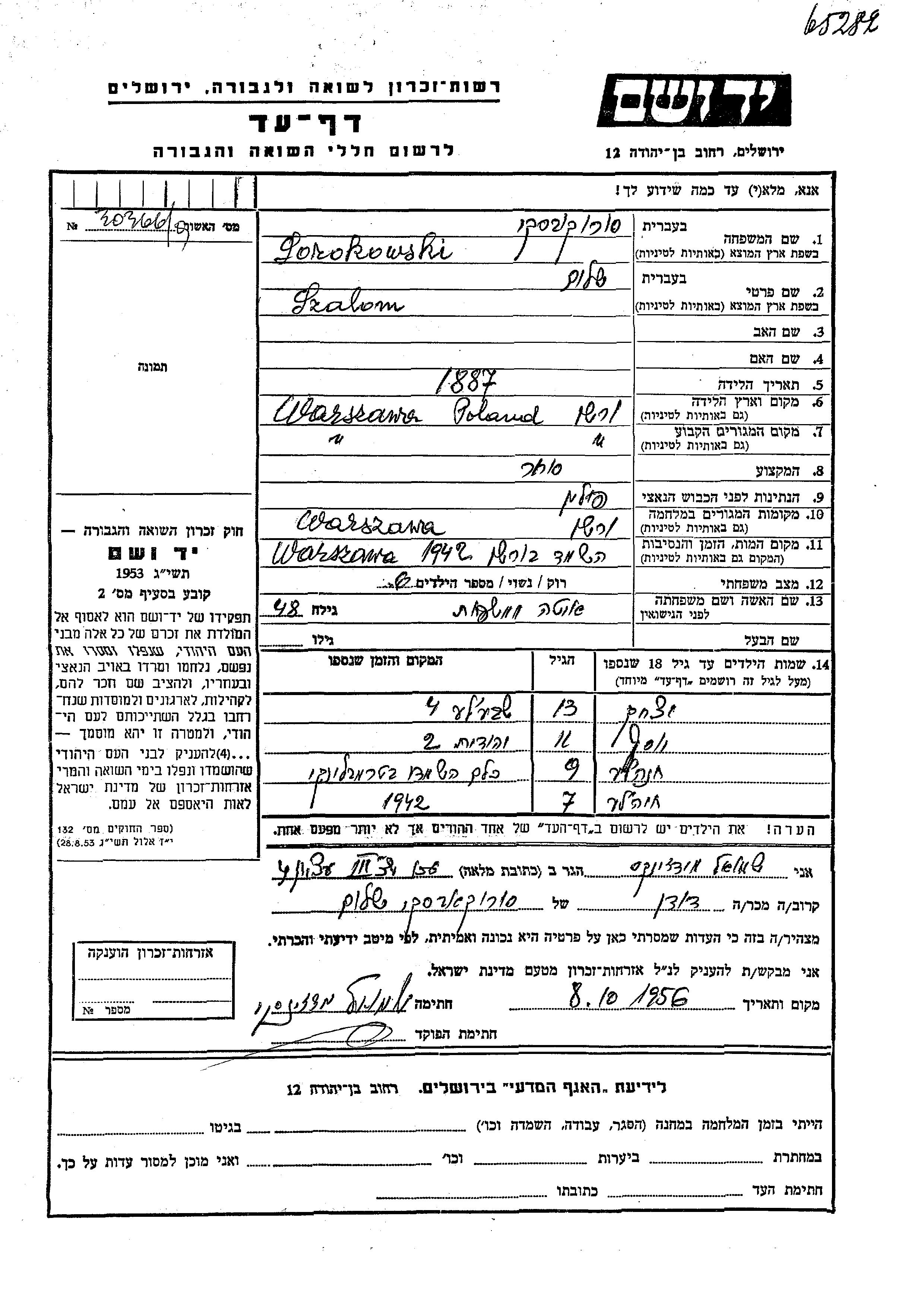 Sorokowski Yitzkhak Warszawa, Polen Gedenkblatt