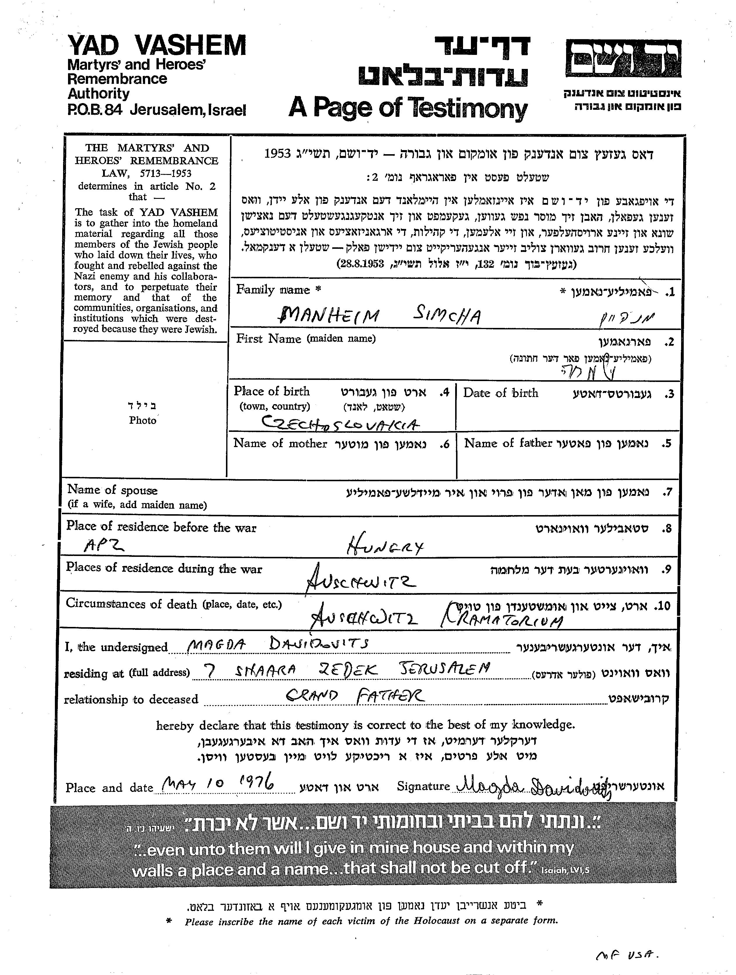 Simcha Manheim wurde in Tschechoslowakei geboren. Vor dem Zweiten Weltkrieg lebte er in Ungarn. Während des Krieges war er in Auschwitz, Polen.