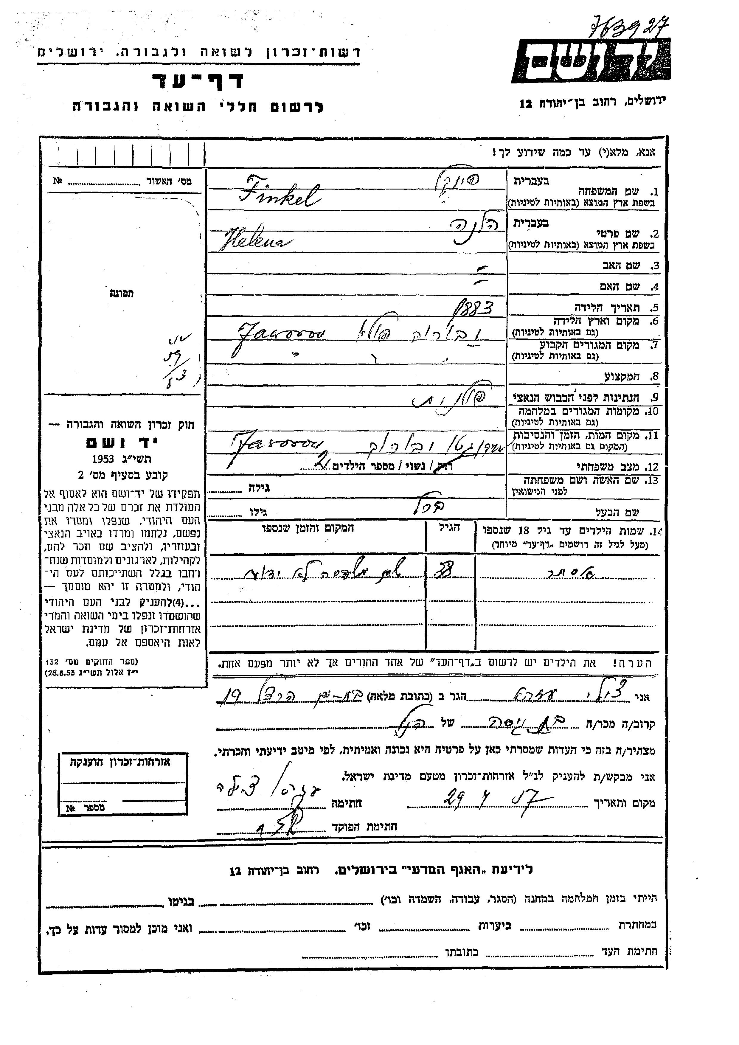 Finkel Ester Jaworow, Polen Gedenkblatt