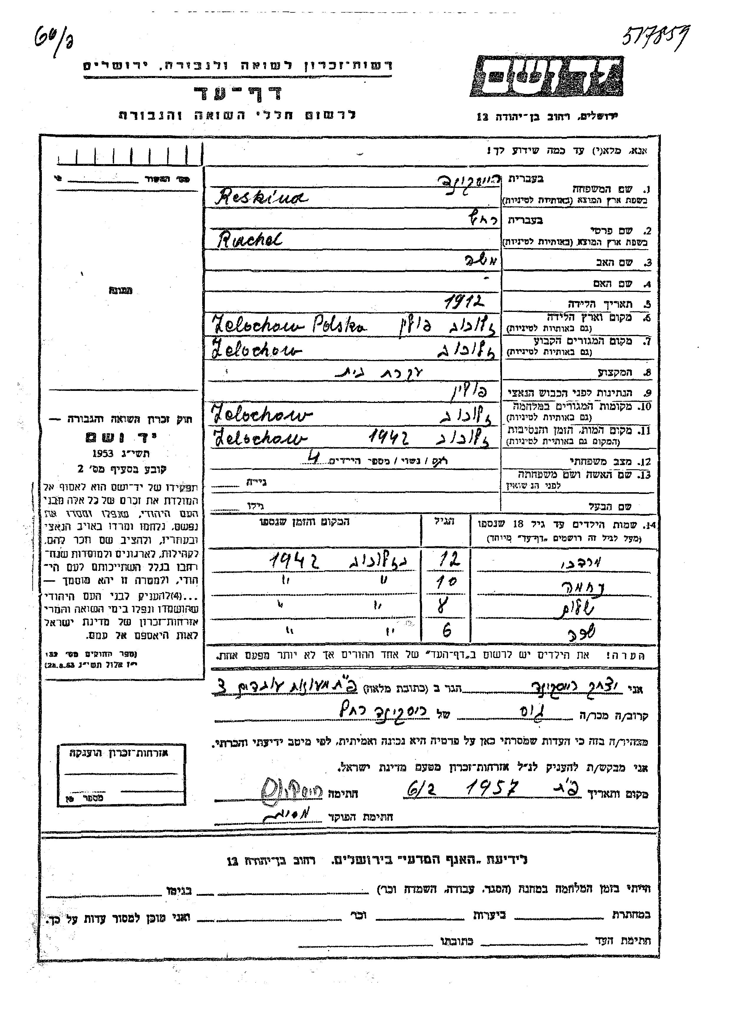 Shalom Reskind wurde Er war der Sohn von Rachel. Er war Kind. Vor dem Zweiten Weltkrieg lebte er in Zelochow, Polen. Während des Krieges war er in Zelochow, Polen.