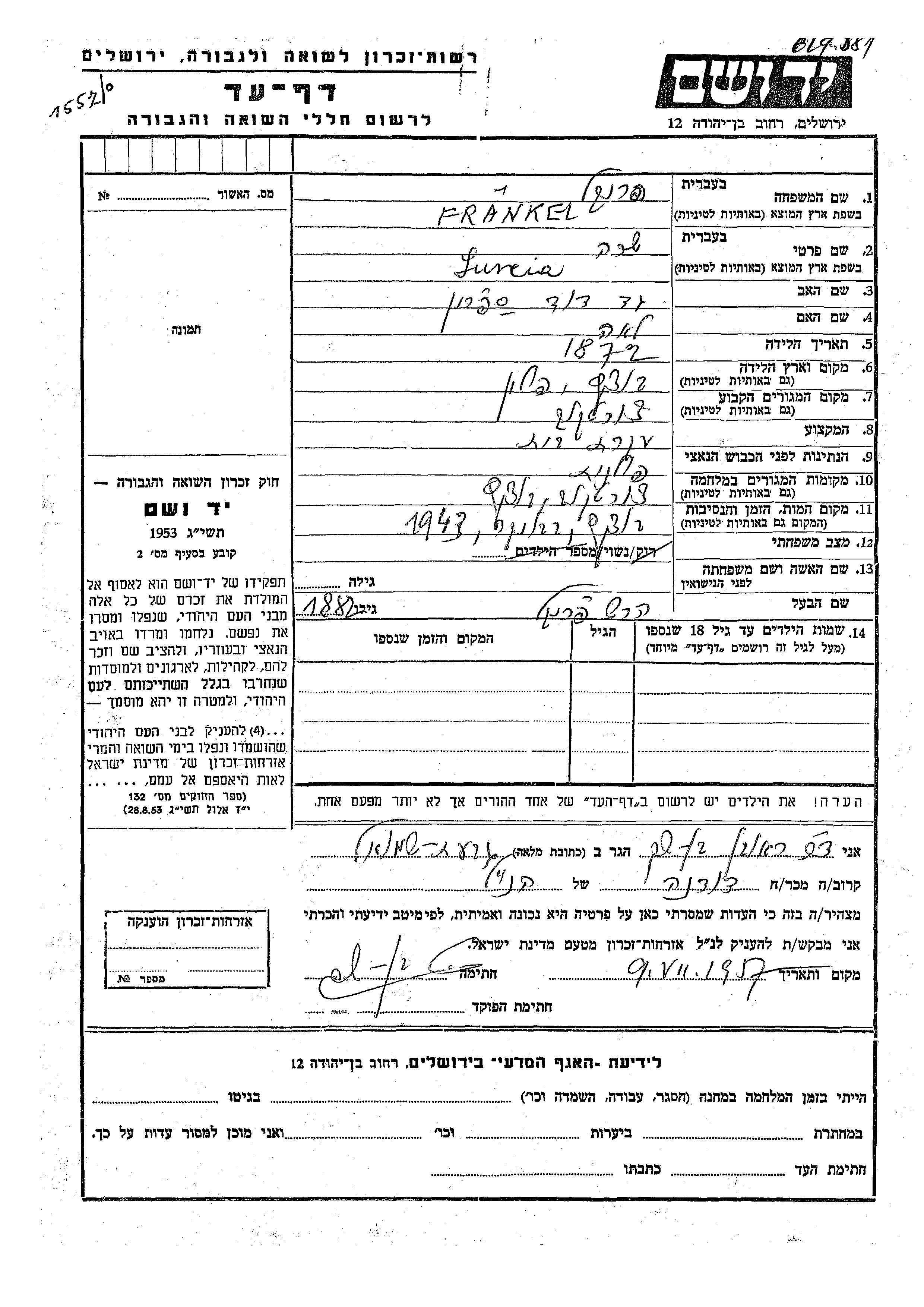 Surcia Frenkel, geb. Safron wurde im Jahr 1872 in Buczacz, Polen geboren. Sie war die Tochter von Gad David und Lea. Sie war Hausfrau und mit Hersh Verheiratet. Vor dem Zweiten Weltkrieg lebte sie in Czortowiec, Polen. Während des Krieges war sie in Buczacz, Polen.