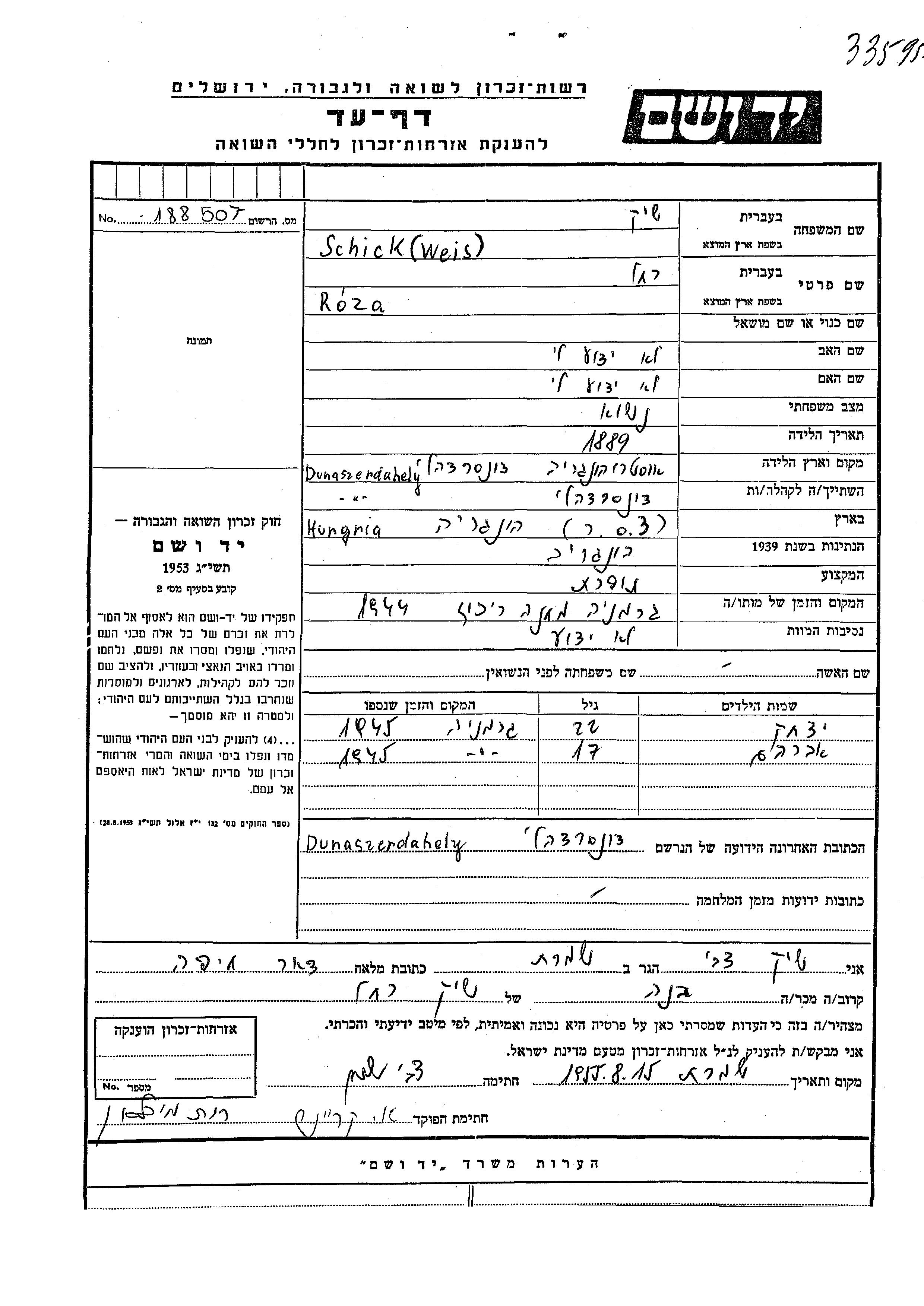 Yitzkhak Schick wurde Er war der Sohn von Roza Rakhel, geb. Weis. Vor dem Zweiten Weltkrieg lebte er in Dunaszerdahely, Tschechoslowakei.