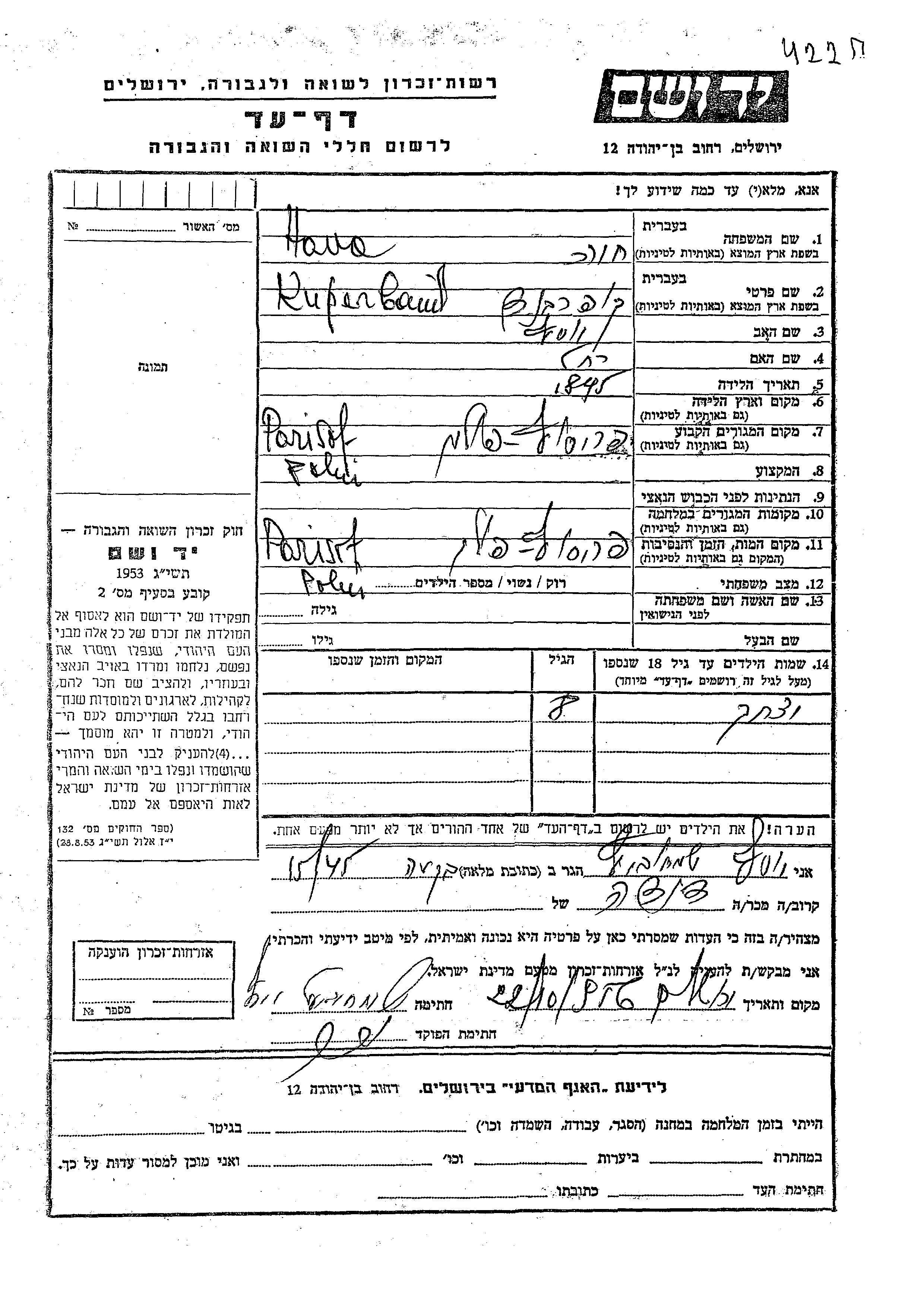 Yitzkhak Kuperband wurde Er war der Sohn von Hava. Er war Kind. Vor dem Zweiten Weltkrieg lebte er in Parisof, Polen.