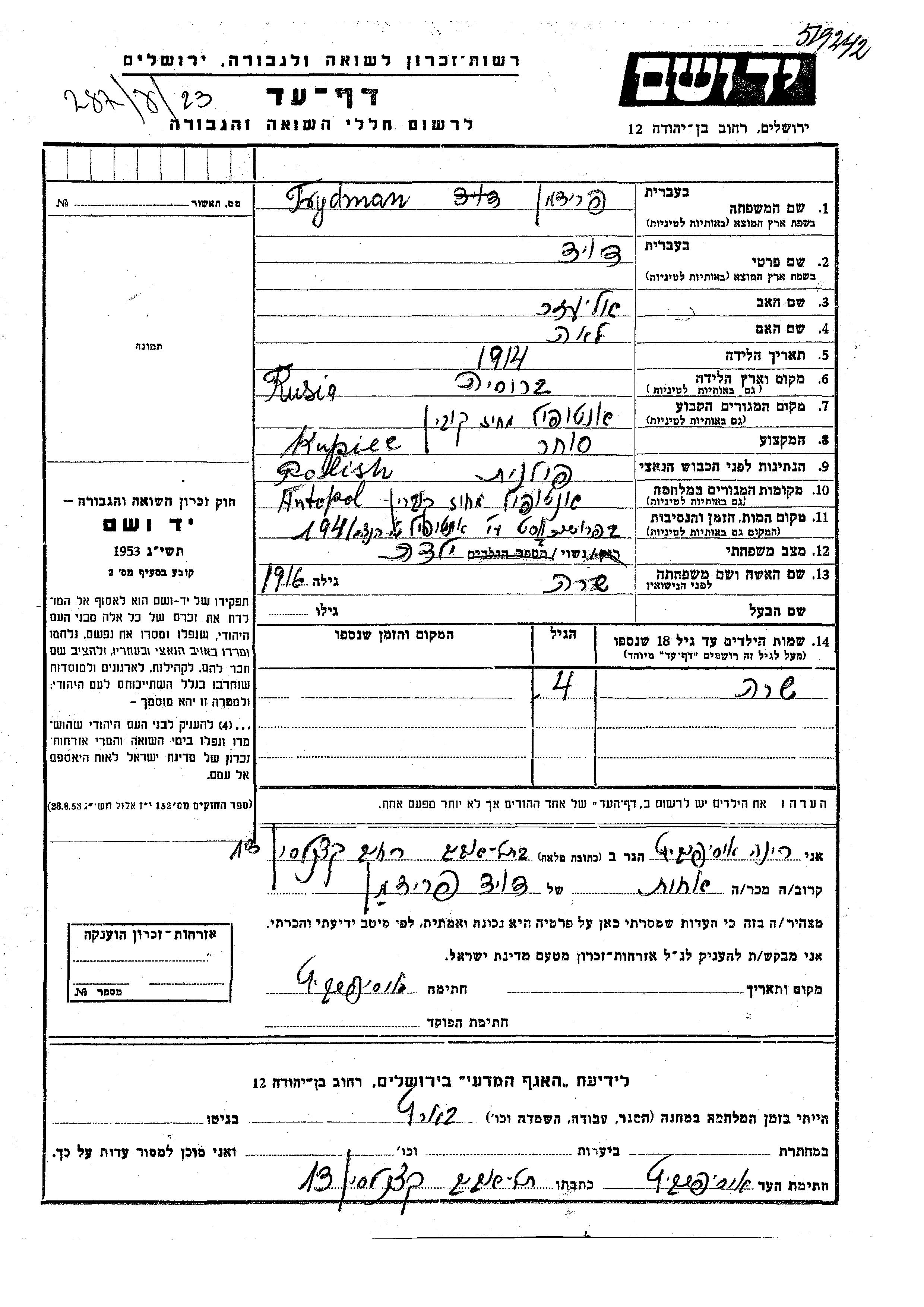 Sara Frydman wurde Sie war die Tochter von David und Sara. Sie war Kind. Vor dem Zweiten Weltkrieg lebte sie in Antopole, Polen. Während des Krieges war sie in Antopole, Polen.