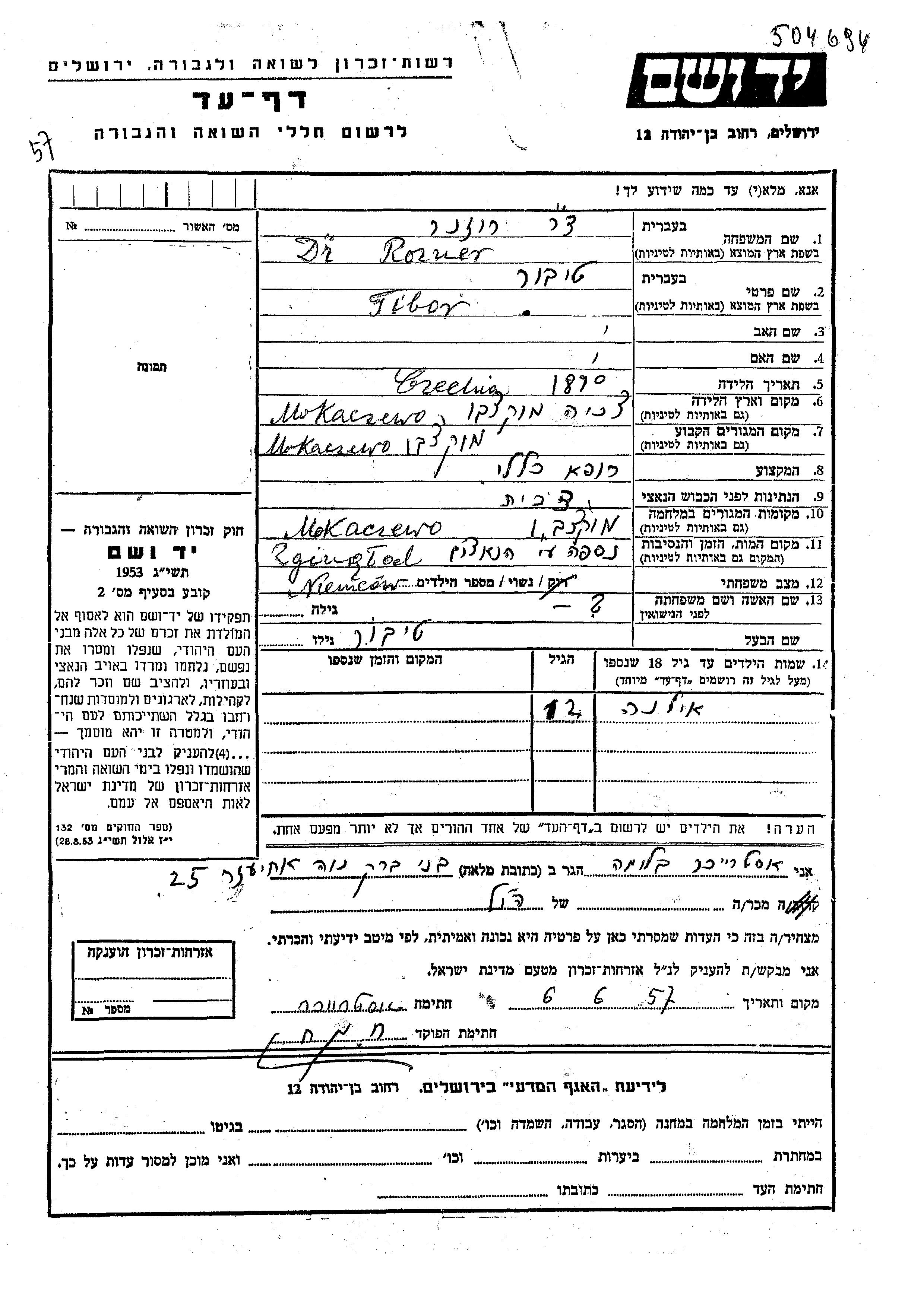 Rozner Ilana Mukacevo, Tschechoslowakei Gedenkblatt
