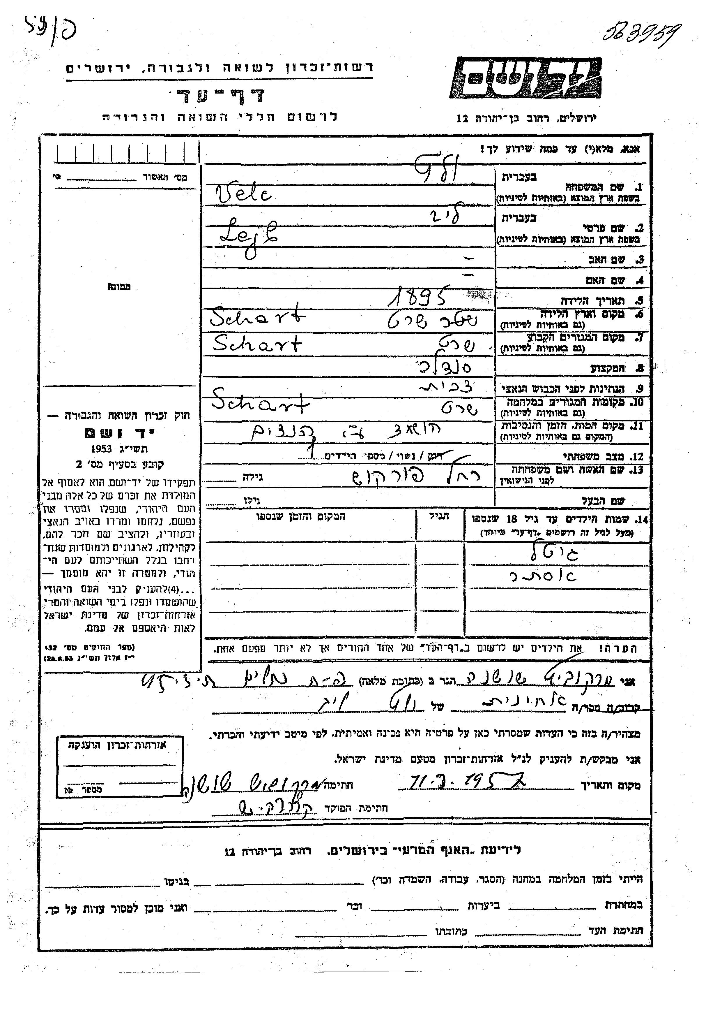 Ester Velc wurde Sie war die Tochter von Lejb und Rakhel, geb. Forkosh. Sie war Kind. Vor dem Zweiten Weltkrieg lebte sie in Schart, Tschechoslowakei. Während des Krieges war sie in Schart, Tschechoslowakei.