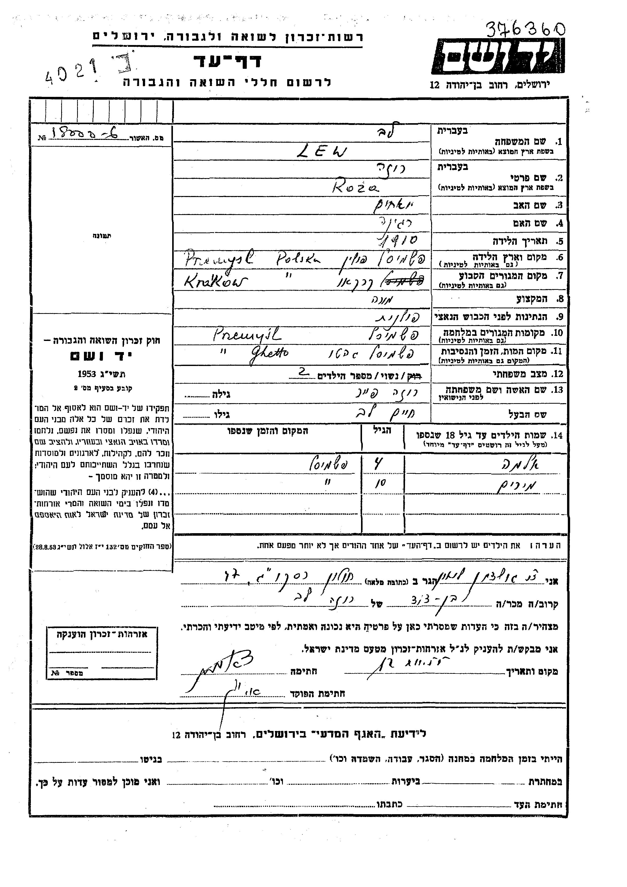 Alma Lew wurde Sie war die Tochter von Khaim und Roza, geb. Foier. Sie war Kind. Vor dem Zweiten Weltkrieg lebte sie in Krakow, Polen. Während des Krieges war sie in Psemisel, Polen.