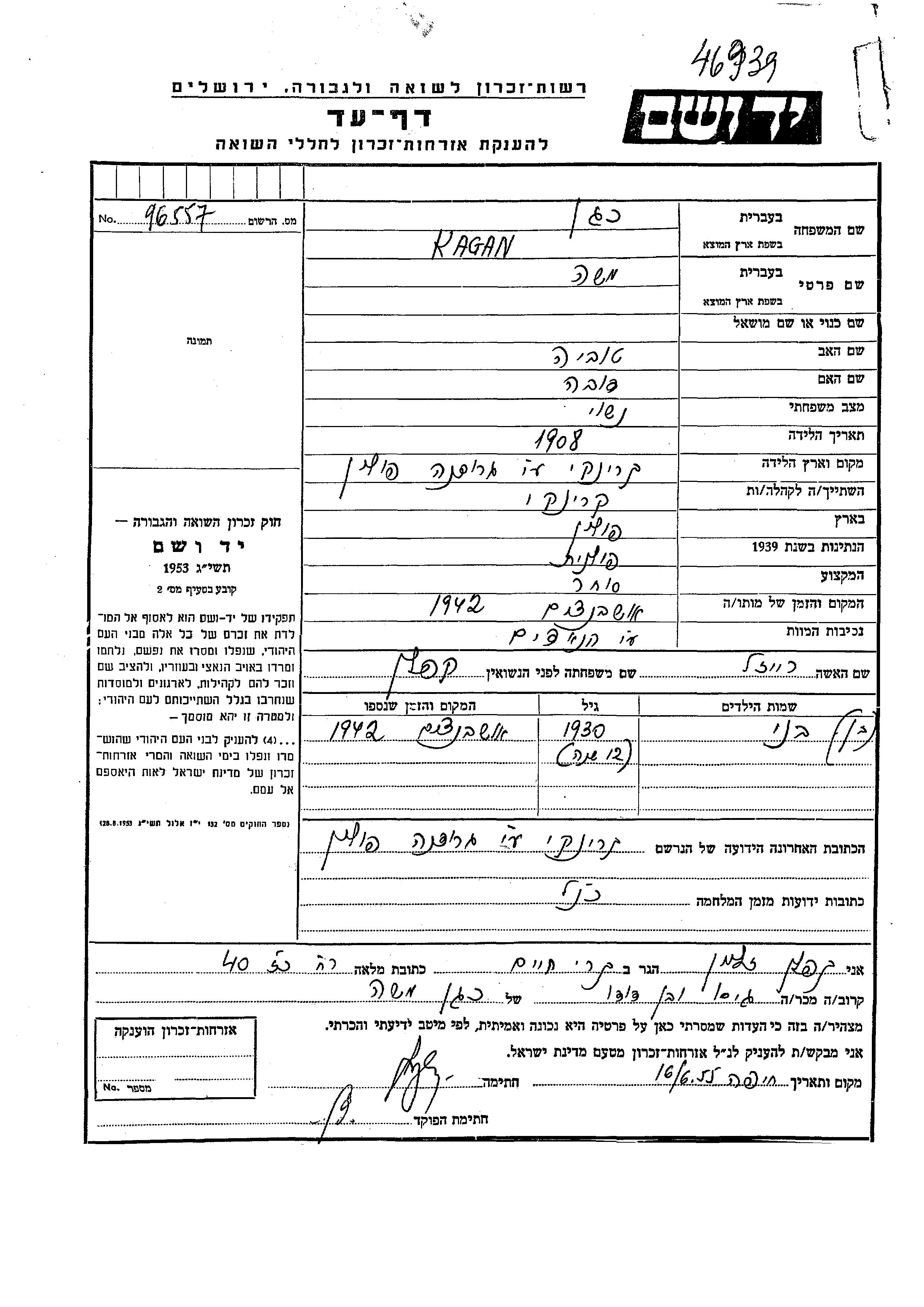 Beni Kagan wurde im Jahr 1930 geboren. Er war der Sohn von Moshe und Reizl, geb. Kaplan. Er war Kind. Vor dem Zweiten Weltkrieg lebte er in Krinki, Polen. Während des Krieges war er in Krinki, Polen.