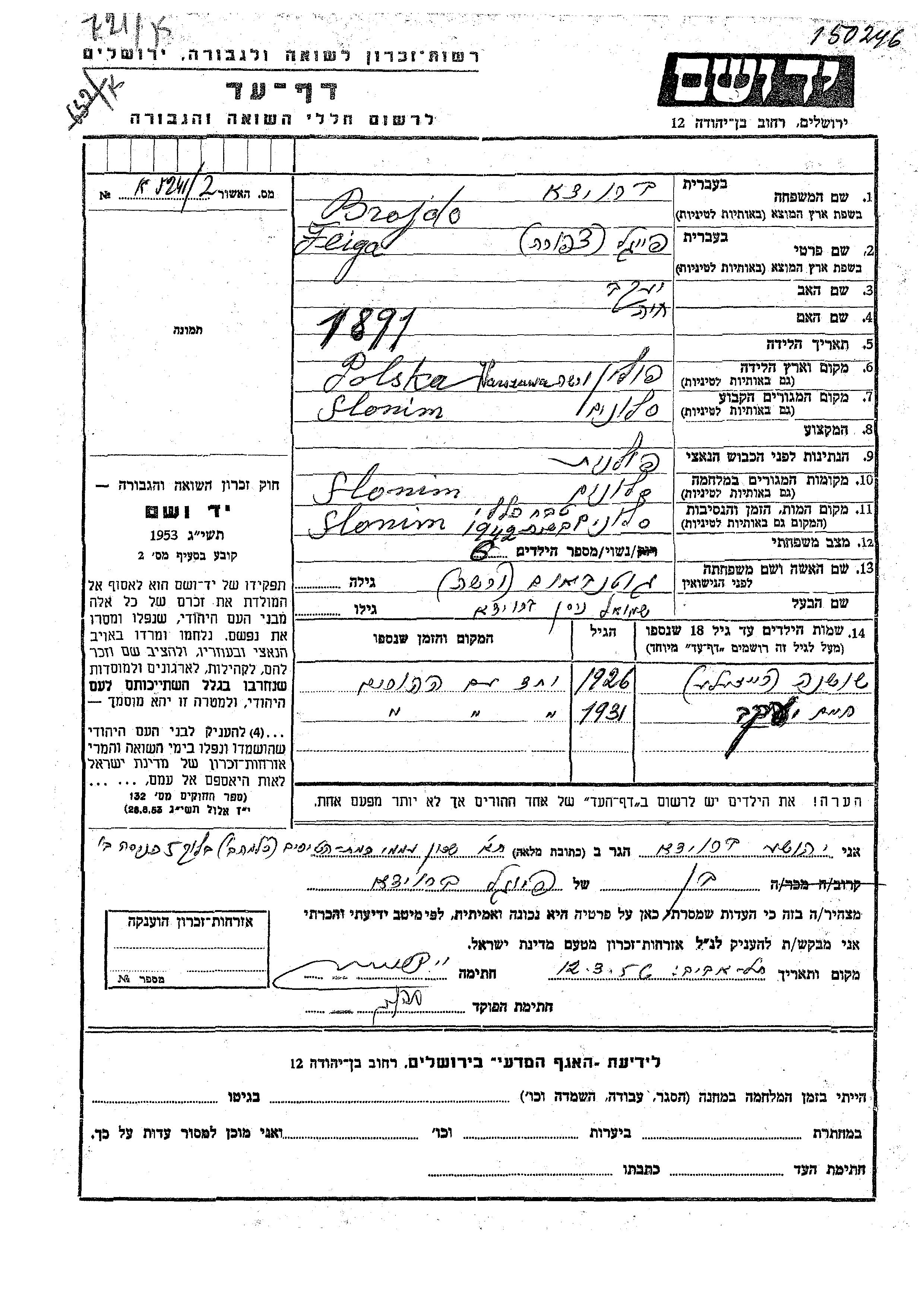 Brojdo Shoshana Reizele 1926 Slonim, Polen Gedenkblatt