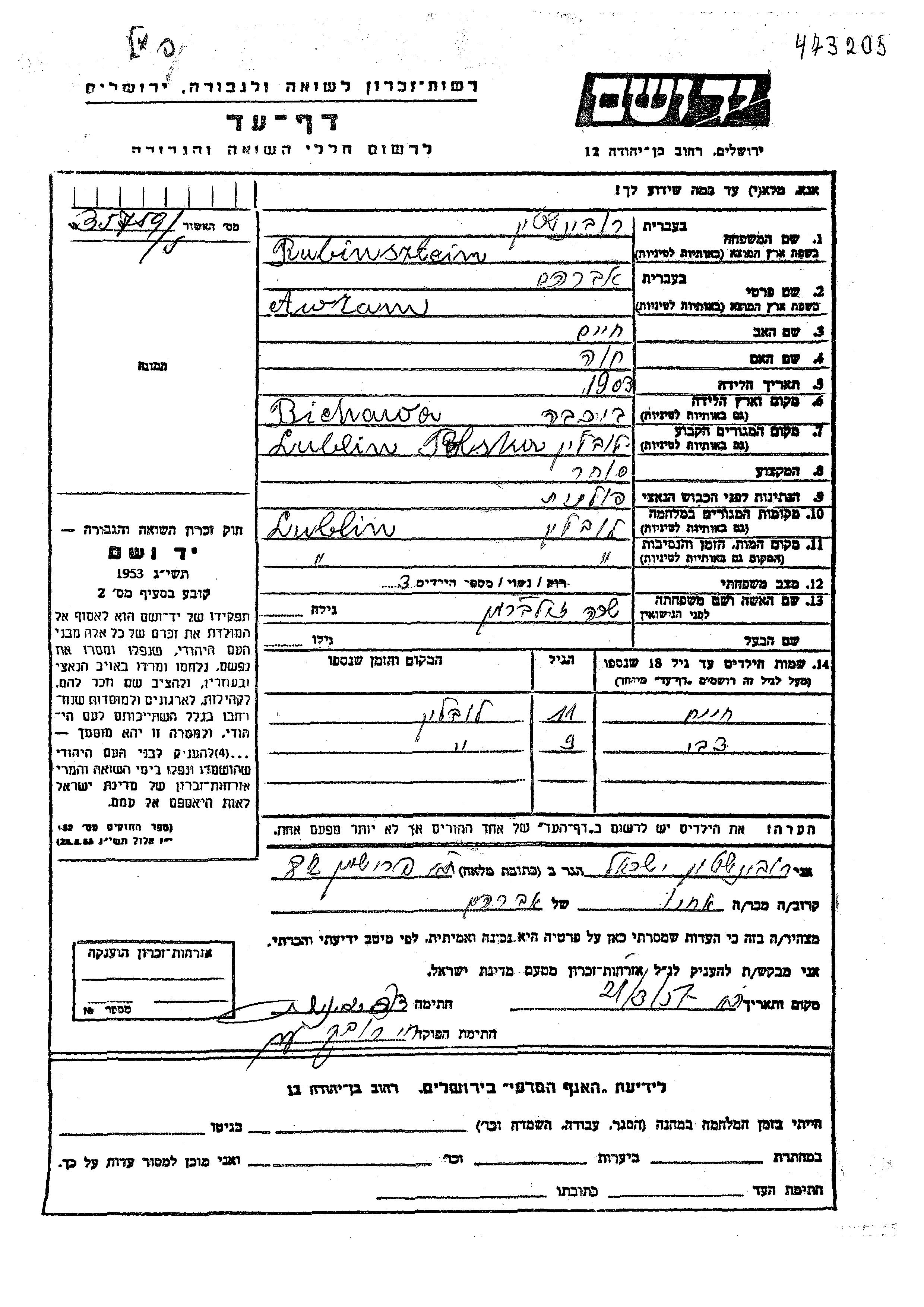 Khaim Rubinstein wurde Er war der Sohn von Awram und Sara, geb. Zilberman. Er war Kind. Vor dem Zweiten Weltkrieg lebte er in Lublin, Polen. Während des Krieges war er in Lublin, Polen.