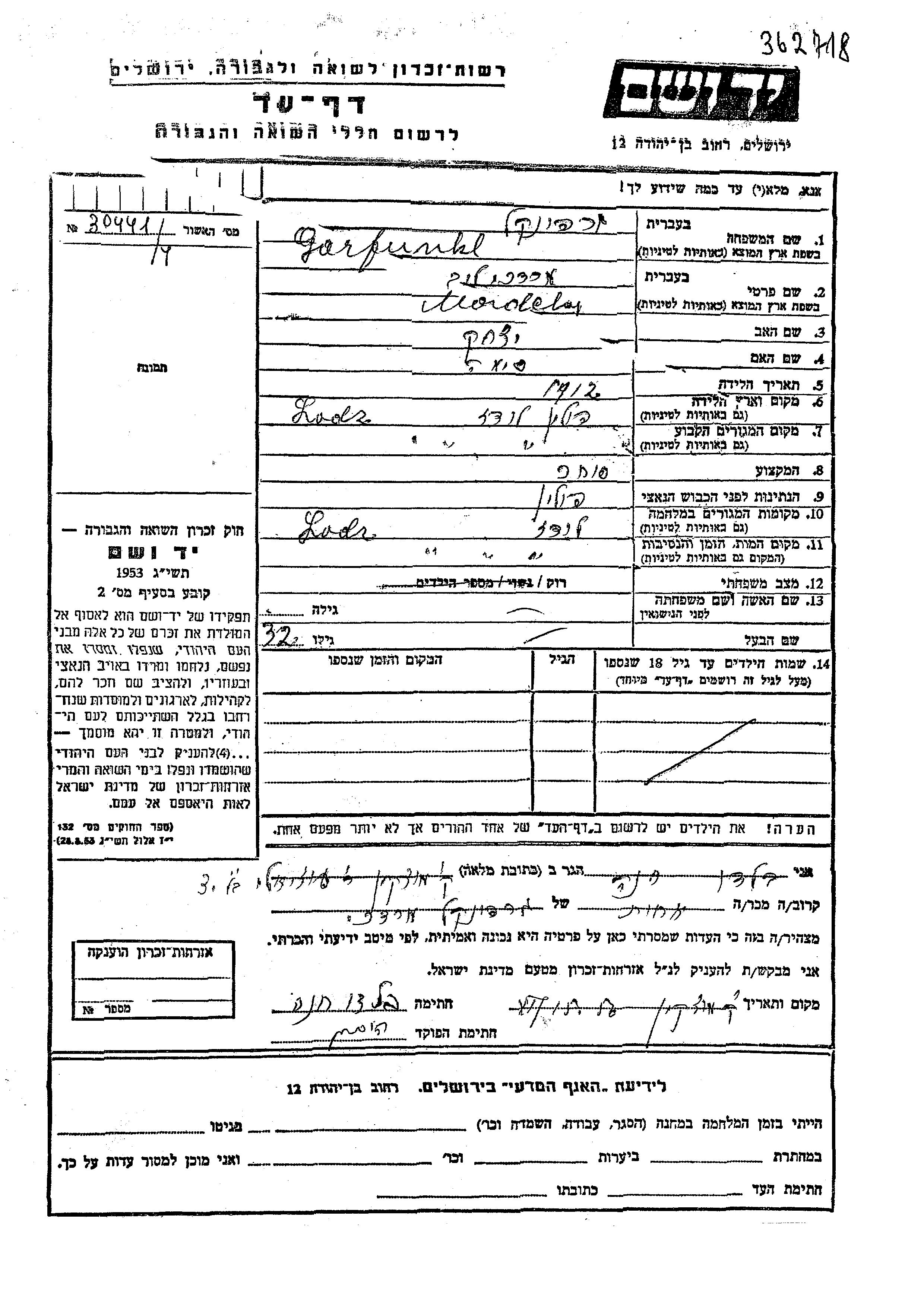 Mordecai Leib Garfunkel wurde im Jahr 1912 in Lodz, Polen geboren. Er war der Sohn von Yitzkhak und Sima. Er war Kaufmann/-frau und Ledig. Vor dem Zweiten Weltkrieg lebte er in Lodz, Polen. Während des Krieges war er in Lodz, Polen.