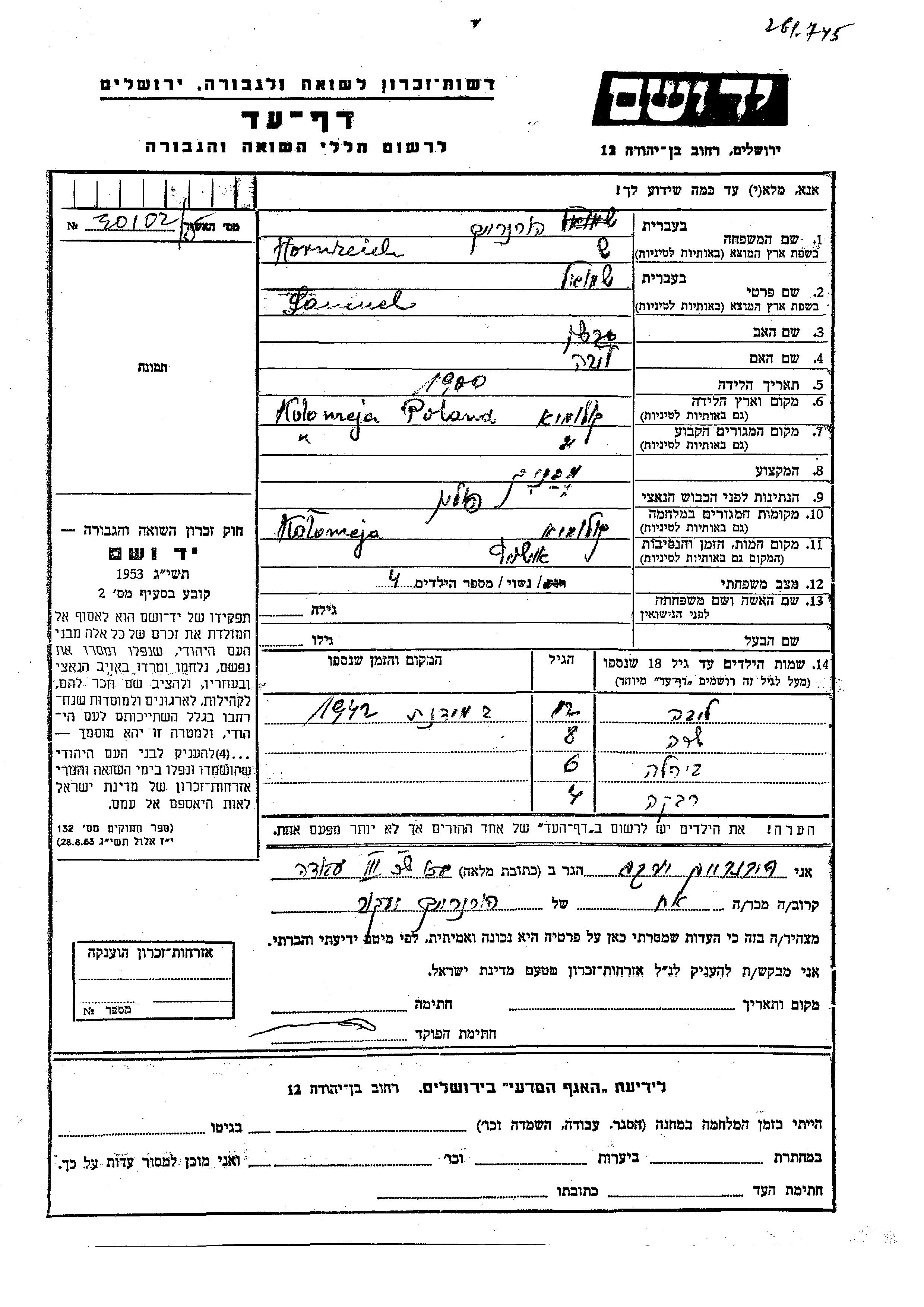 Rivka Hornreich wurde Sie war die Tochter von Shmuel. Sie war Kind. Vor dem Zweiten Weltkrieg lebte sie in Kolomyja, Polen. Während des Krieges war sie in Kolomyja, Polen.