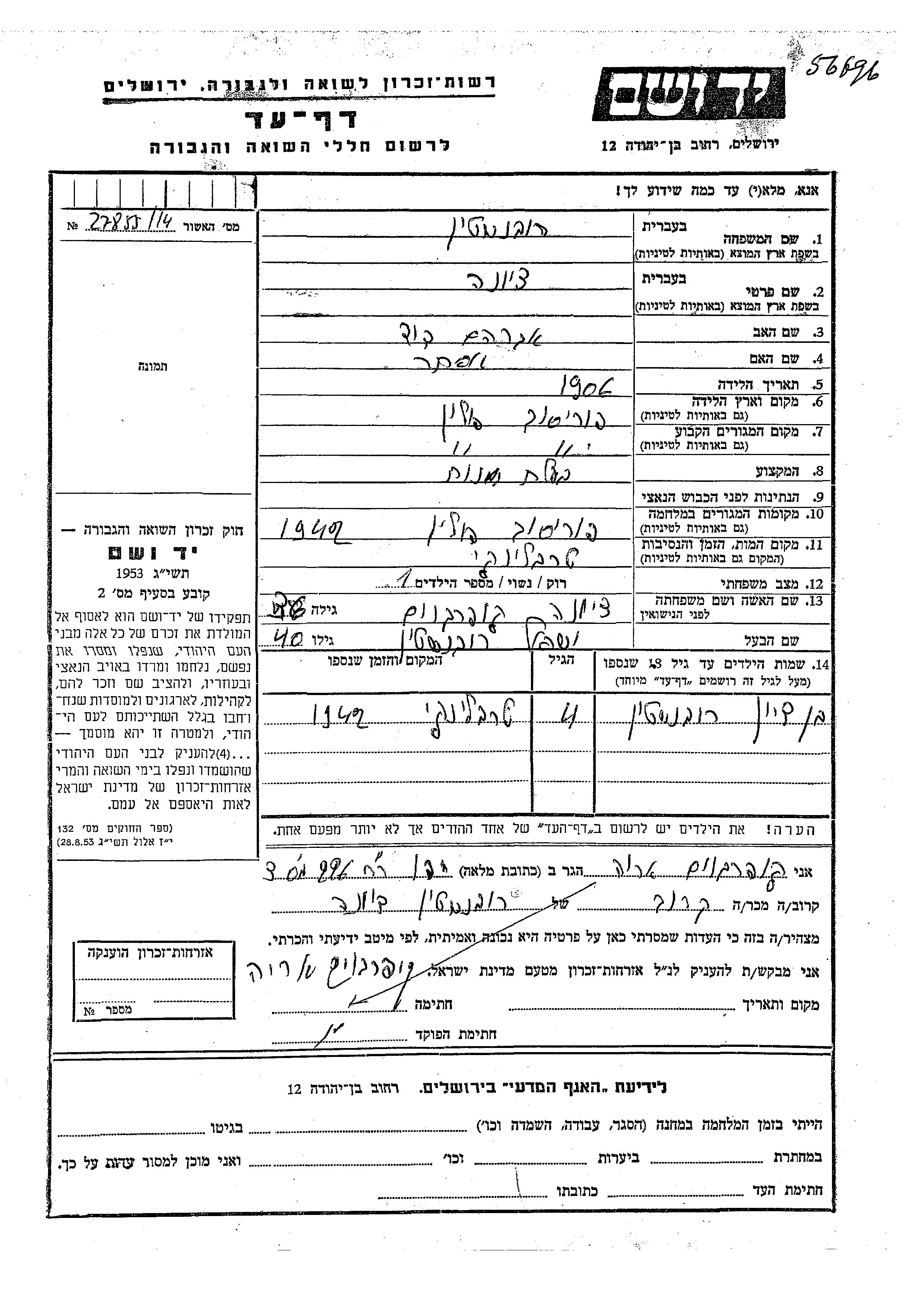 Bentzion Rubinshtein wurde Er war der Sohn von Yisrael und Ziona, geb. Kuperbaum. Er war Kind. Vor dem Zweiten Weltkrieg lebte er in Porisov, Polen. Während des Krieges war er in Porisov, Polen.