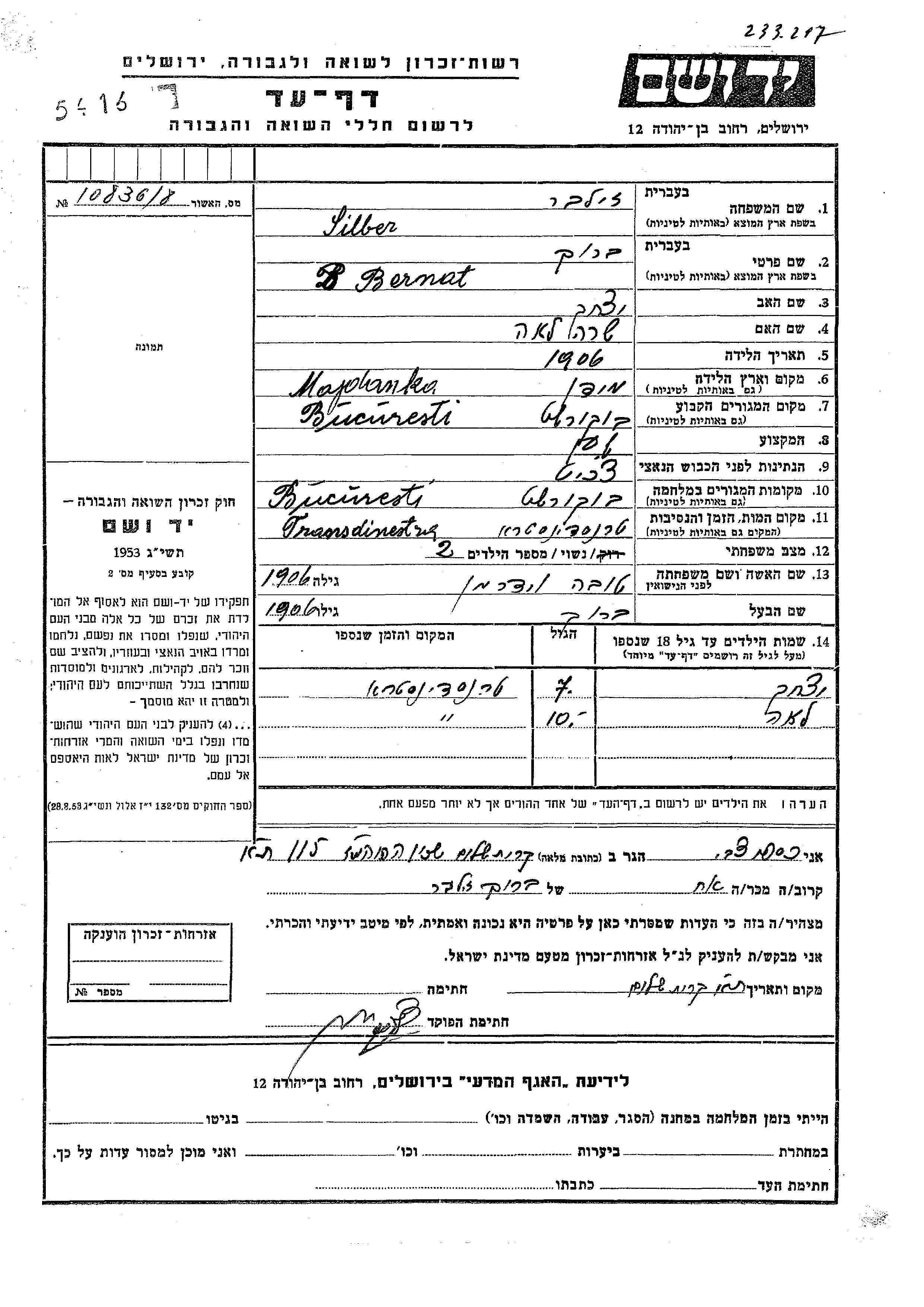 Yitzkhak Zilber wurde Er war der Sohn von Barukh Bernat und Tova, geb. Viderman. Er war Kind. Vor dem Zweiten Weltkrieg lebte er in Bucuresti, Rumänien. Während des Krieges war er in Bucuresti, Rumänien.