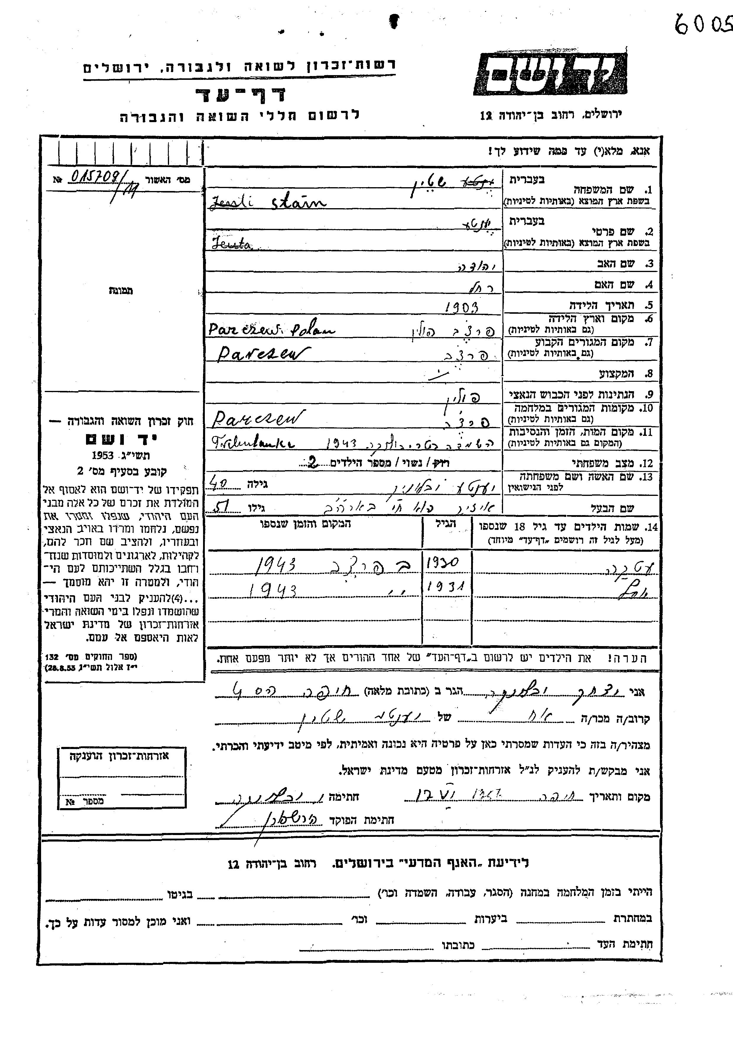 Etka Stain wurde im Jahr 1930 geboren. Sie war die Tochter von Aizik und Jenta, geb. Iablonek. Sie war Kind. Vor dem Zweiten Weltkrieg lebte sie in Parczew, Polen. Während des Krieges war sie in Parczew, Polen.