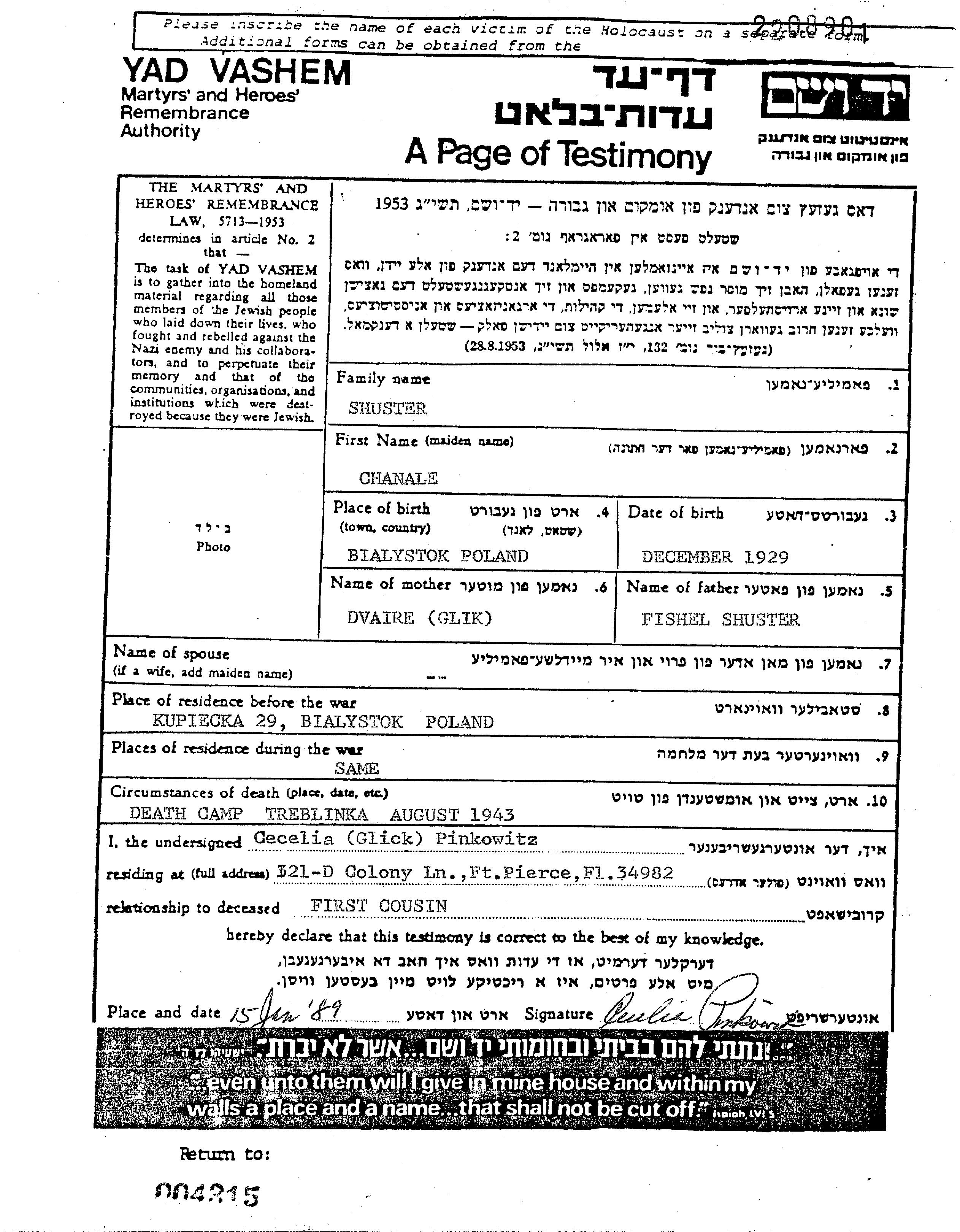 Shuster Chana Bialystok, Polen Gedenkblatt