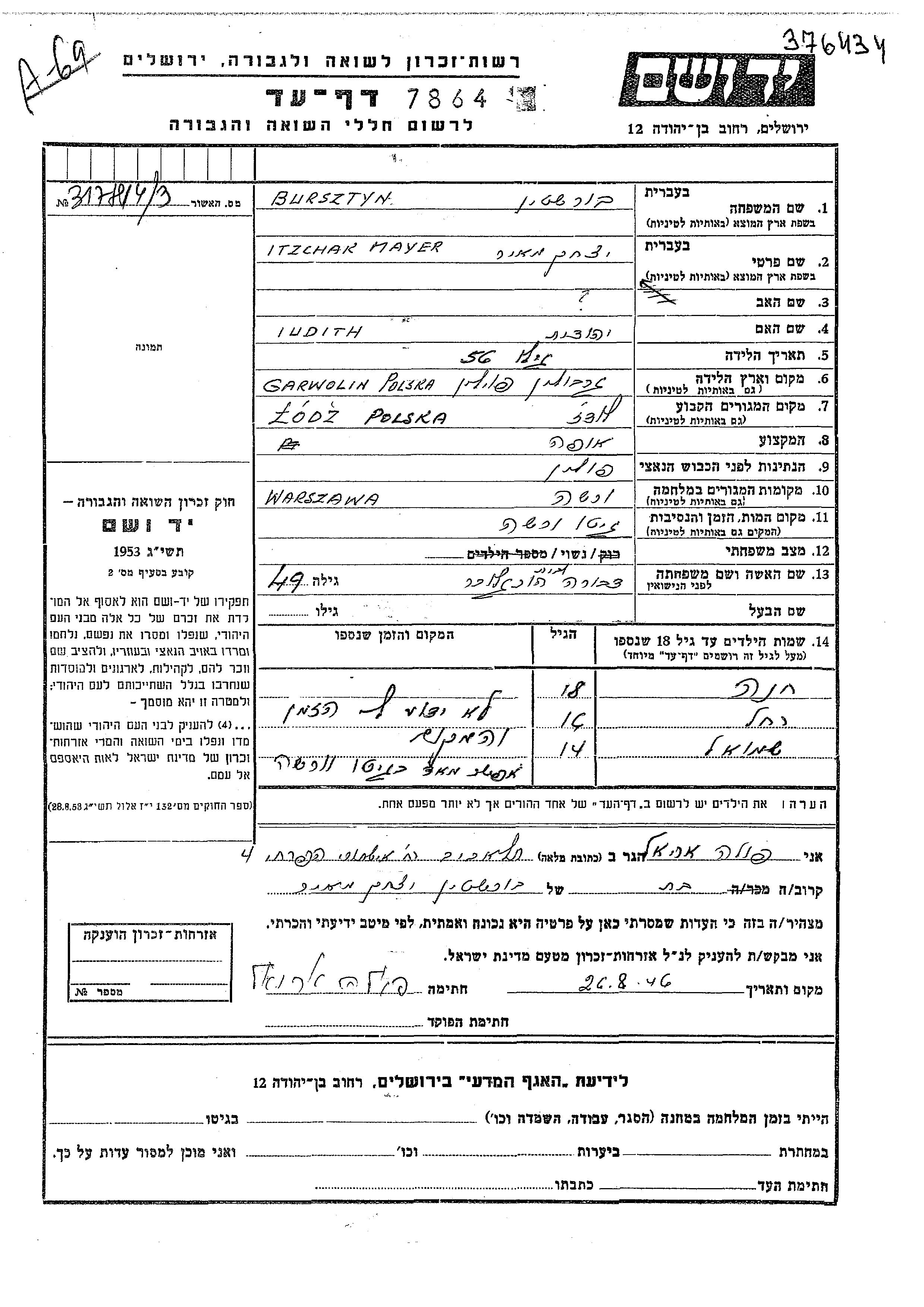 Shmuel Bursztyn wurde Er war der Sohn von Itzchak Mayer und Dvora, geb. Hokhglauber. Er war Kind. Vor dem Zweiten Weltkrieg lebte er in Lodz, Polen. Während des Krieges war er in Warszawa, Polen.