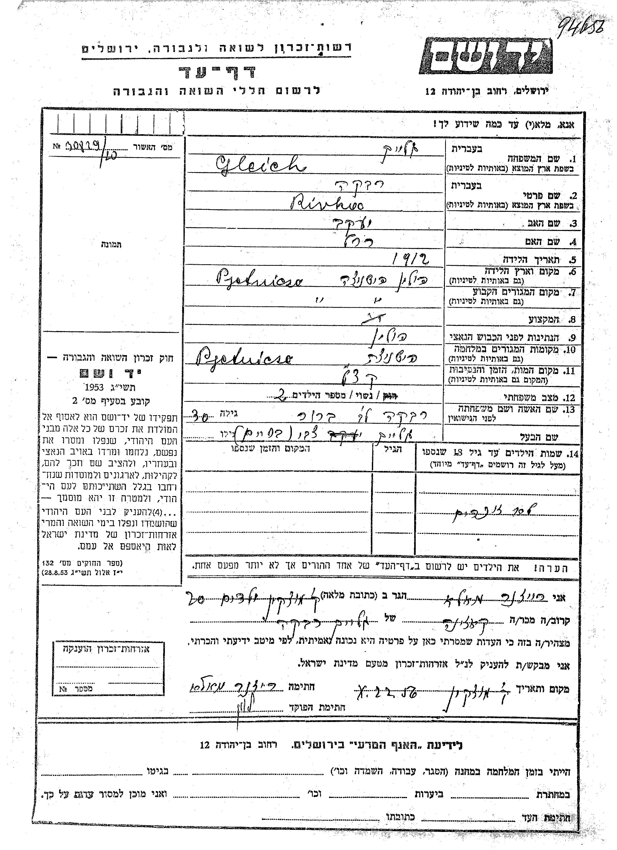 Rivka Gleich Glik, geb. Braver wurde im Jahr 1912 in Pietnice, Polen geboren. Sie war die Tochter von Yaakov und Rakhel. Sie war mit Tzvi Verheiratet. Vor dem Zweiten Weltkrieg lebte sie in Pietnice, Polen. Während des Krieges war sie in Pietnice, Polen.