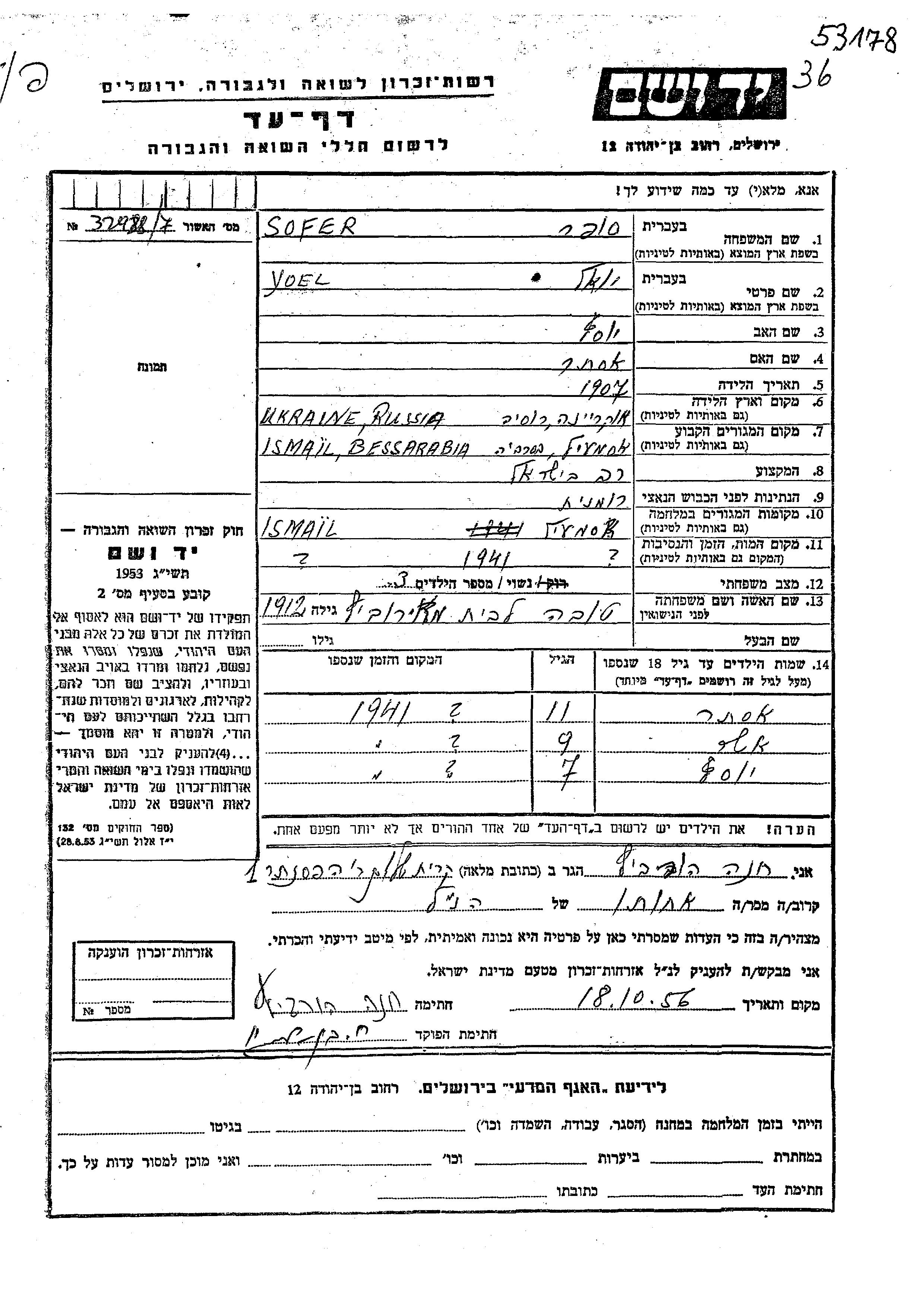 Ester Sofer wurde Sie war die Tochter von Yoel und Tova, geb. Meirovitz. Sie war Kind. Vor dem Zweiten Weltkrieg lebte sie in Ismail, Rumänien. Während des Krieges war sie in Ismail, Rumänien.