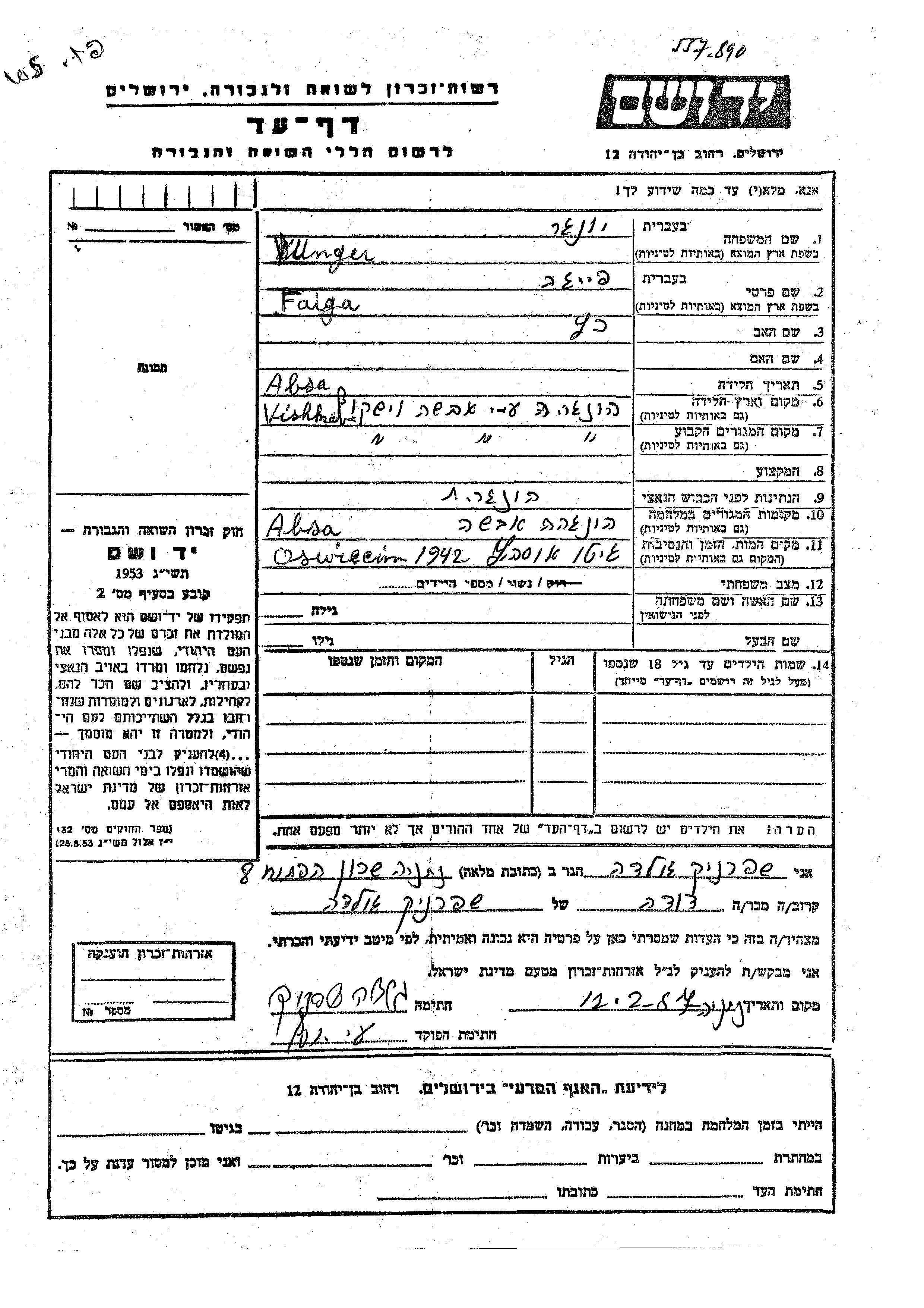 Feiga Unger Iunger, geb. Katz wurde in Apsa, Tschechoslowakei geboren. Sie war Verheiratet. Vor dem Zweiten Weltkrieg lebte sie in Vishkovo, Tschechoslowakei. Während des Krieges war sie in Apsa, Tschechoslowakei.