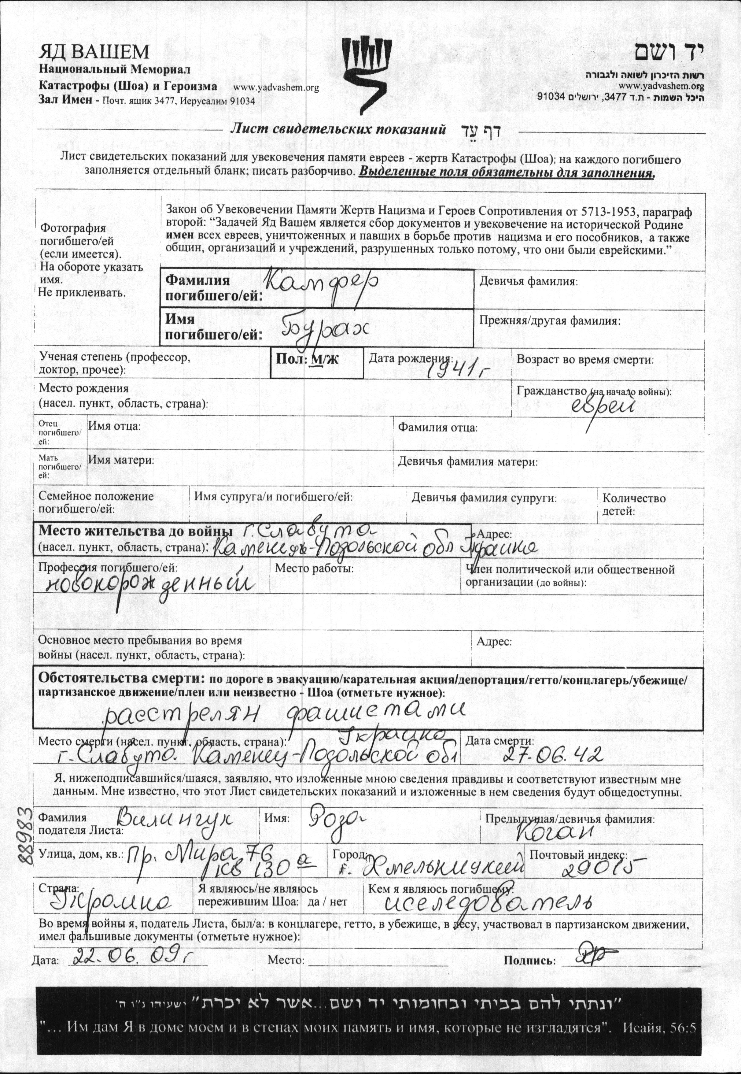 Burakh Kamfer wurde im Jahr 1941 geboren. Er war Säugling. Vor dem Zweiten Weltkrieg lebte er in Slavuta, Ukraine (UdSSR).