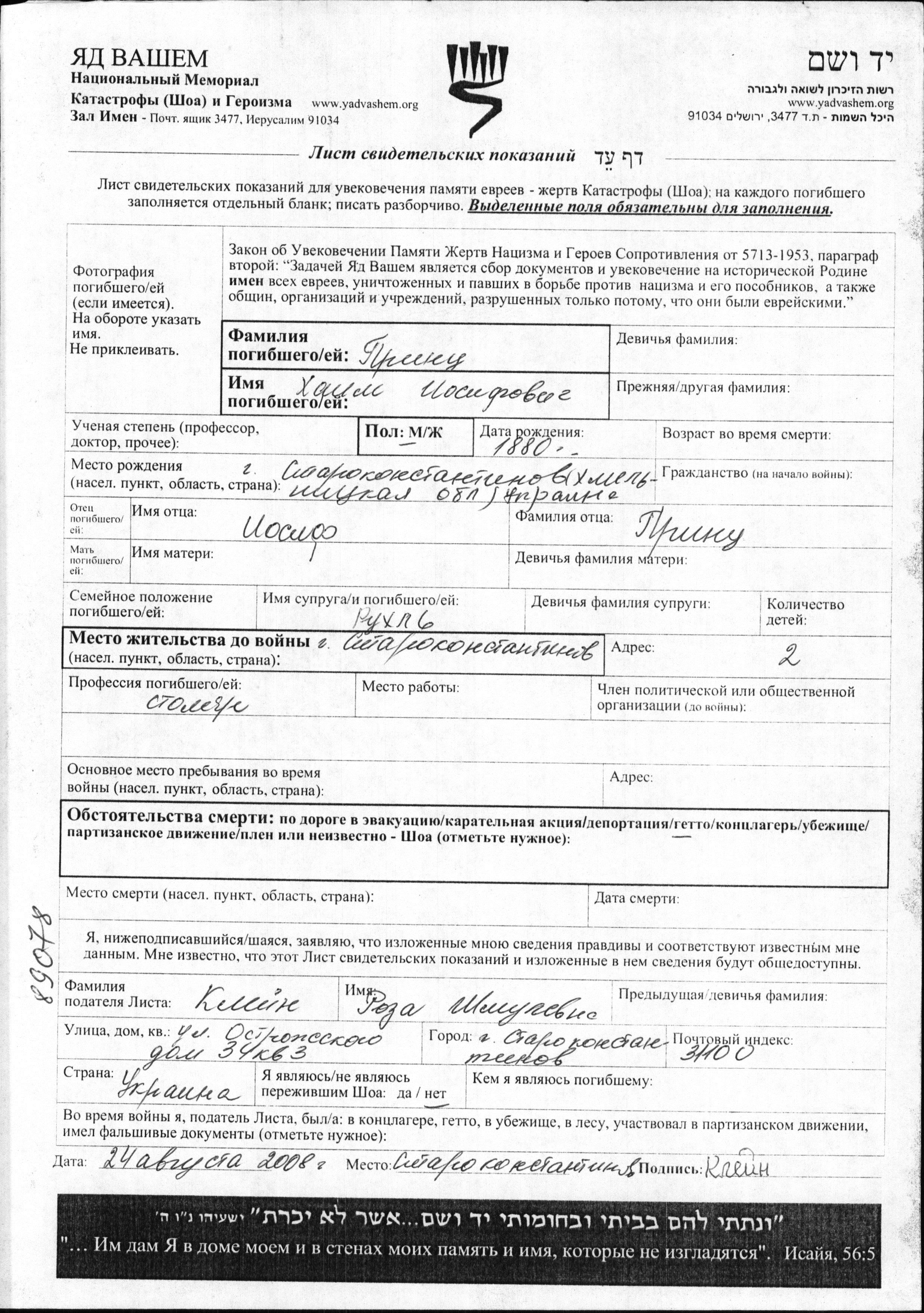 Khaim Printz wurde im Jahr 1880 in Starokonstantinov, Ukraine (UdSSR) geboren. Er war der Sohn von Iosif. Er war Tischler und mit Rukhl Verheiratet. Vor dem Zweiten Weltkrieg lebte er in Starokonstantinov, Ukraine (UdSSR).