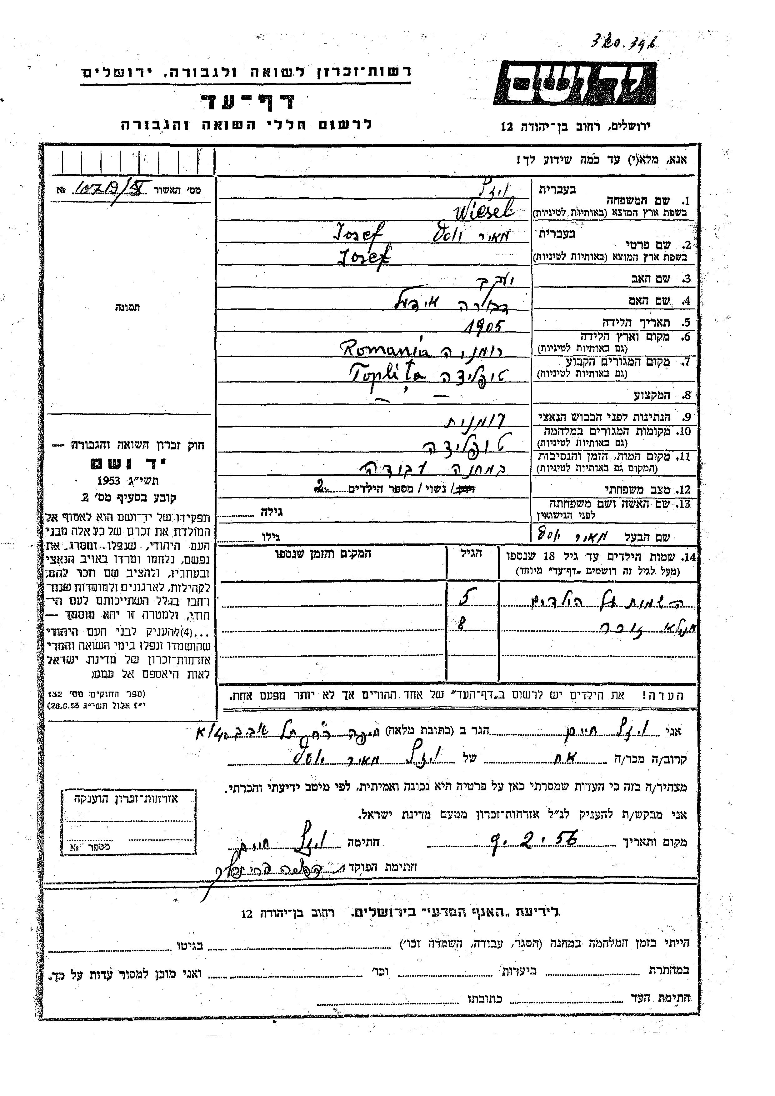 Wiesel Josef Meir 1905 Toplita, Rumänien Gedenkblatt