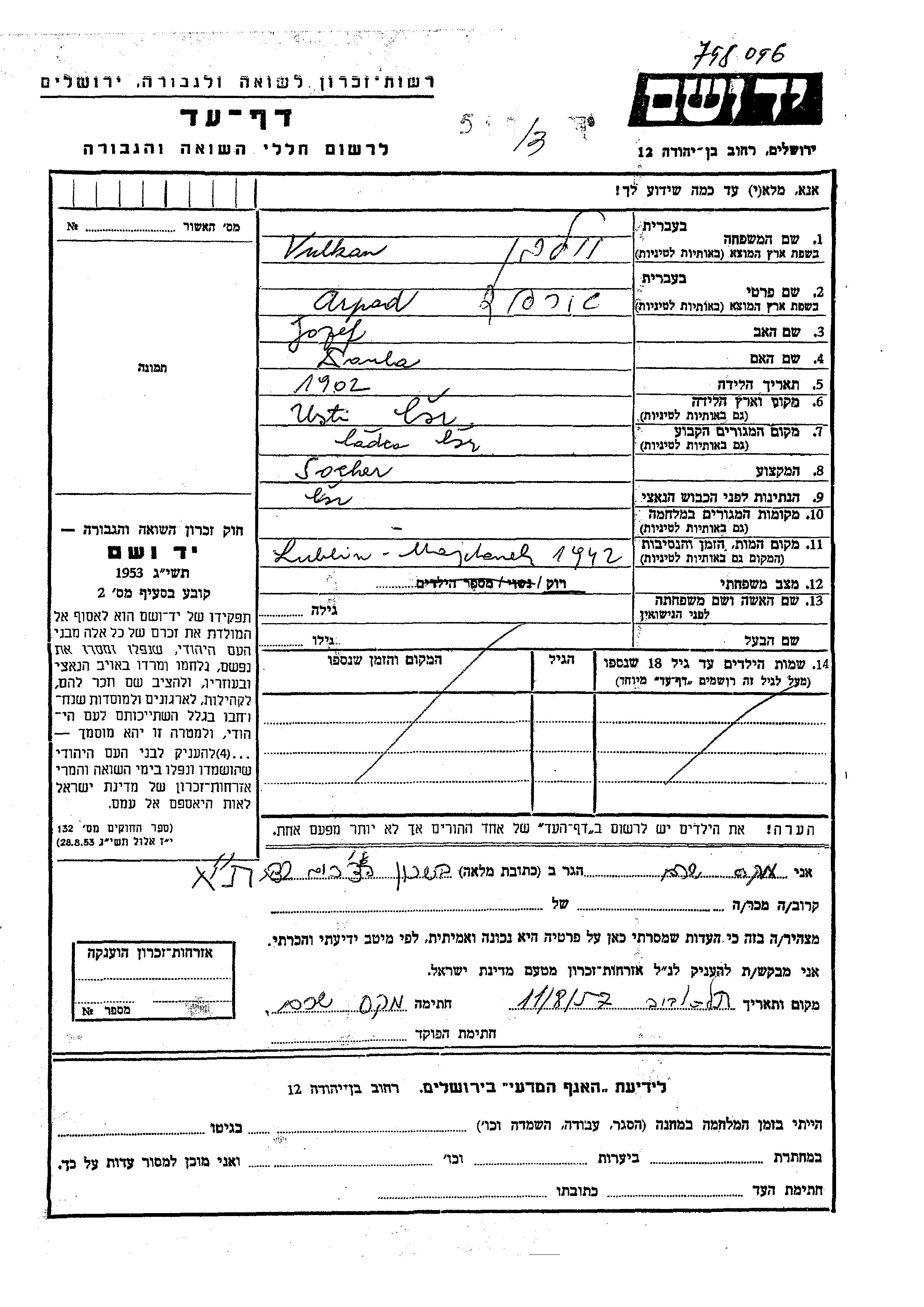 Arpad Vulkan wurde im Jahr 1902 in Ustie, Tschechoslowakei geboren. Er war der Sohn von Jozef und Szula. Er war Kaufmann/-frau und Ledig. Vor dem Zweiten Weltkrieg lebte er in Ladce, Tschechoslowakei.
