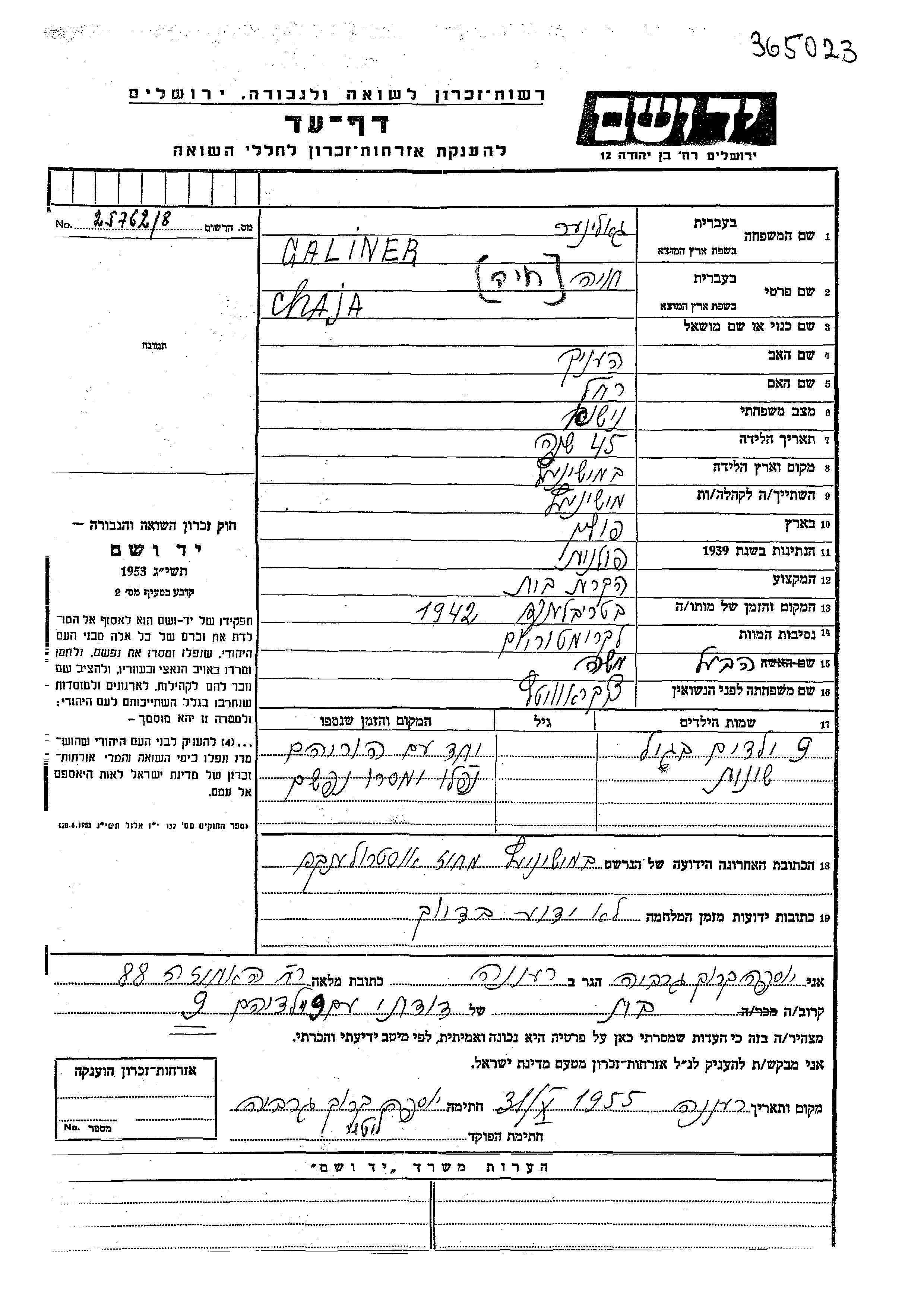 Chaja Khavia Gliner, geb. Tzukrovitz wurde in Mishenits, Polen geboren. Sie war die Tochter von Henikh und Rakhel. Sie war Hausfrau und mit Moshe Verheiratet. Vor dem Zweiten Weltkrieg lebte sie in Mishenits, Polen. Während des Krieges war sie in Mishenits, Polen.